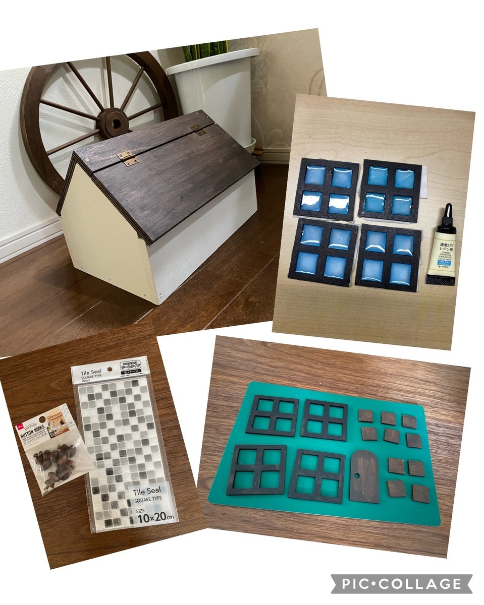 帰り道に寄り道して材料を買って、ドアや窓の木材に色を塗って、レジンがあったので窓風にしてみました😊