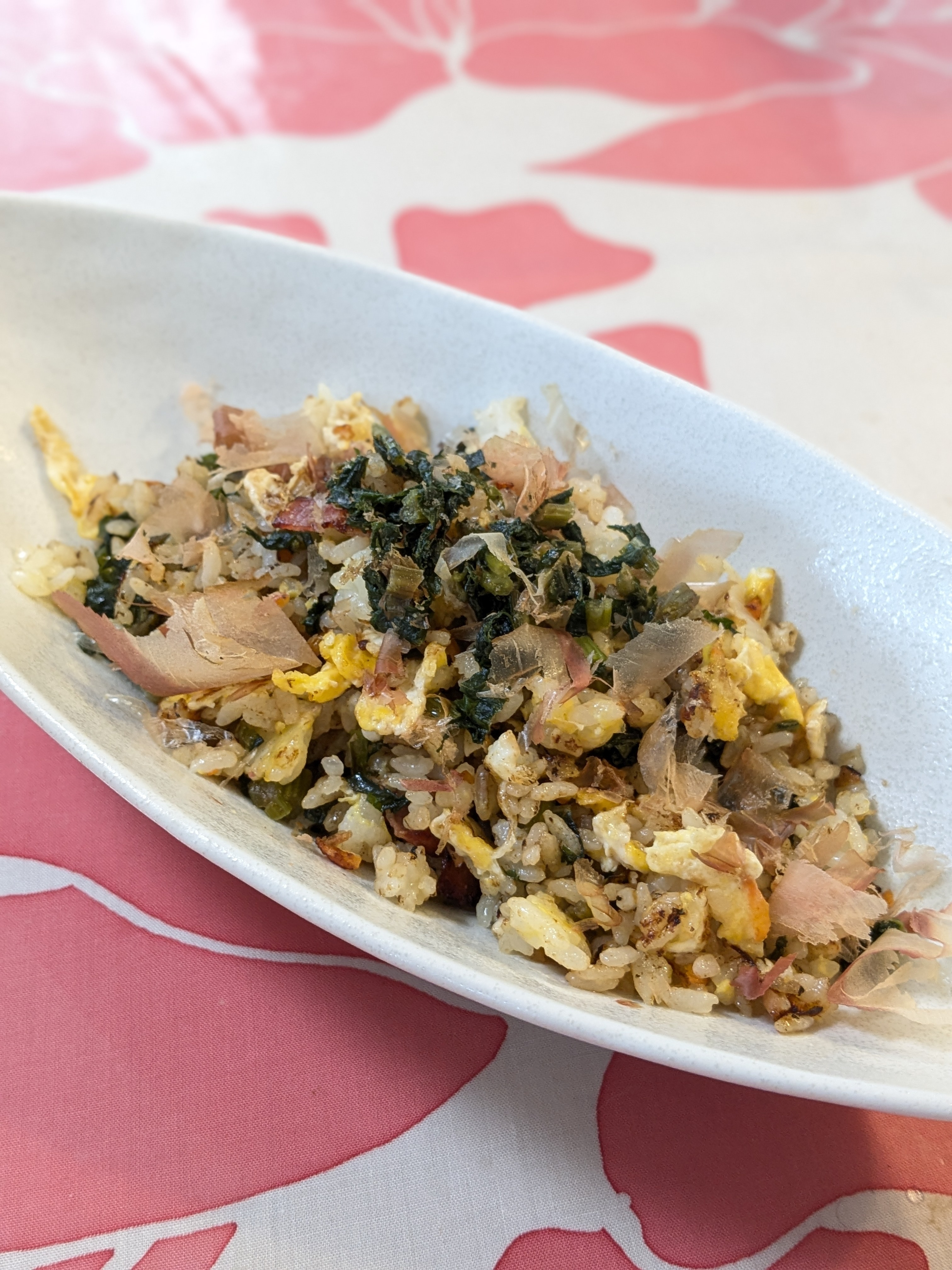 ベーコンお野菜、梅干し入りのチャーハンに大根の葉っぱふりかけを入れて少し炒め、盛り付けてからそのふりかけとかつお節を乗せました!