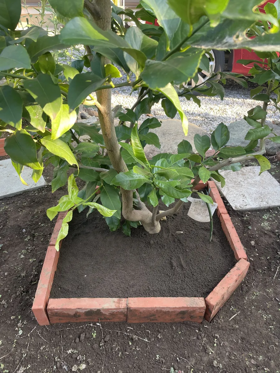 トップ > グリーン > ガーデニング > ユーレカレモンの木、根元をレンガ半ペンでサークル化 ソラ5551 2025/10/30 10:37 ユーレカレモンの木、根元をレンガ半ペンでサークル化 ↑after ↓before 一年前、コンクリ端材でのサークル化。コンクリ端材を土中に隠したんで、半ペンで囲みました。 水平器を当てながら高さを揃えるのに苦心した感じです。 レンガ半ペン10枚で1280円でした。 苗を地植えして3年半、柑橘のいい香りはするんですけど、実が付くのはもう少しでしょうか?この春には初めて花が咲いて、新しい変化があった、というところです。 ↓バックショットです。 いいね 共有する 共有する X LINE リンクをコピー コメントする 0 件の返信 (新着順)
