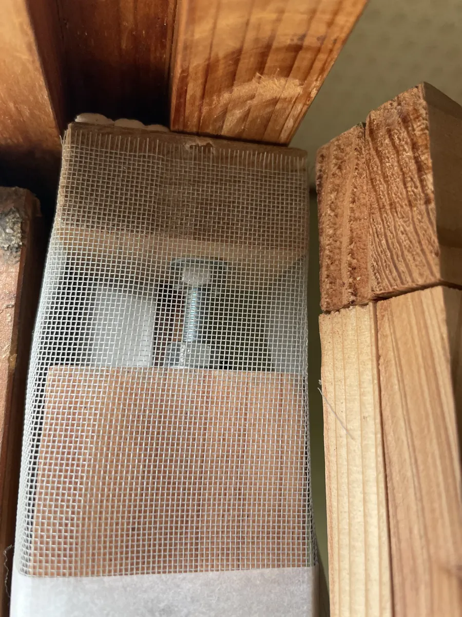 網戸は両面テープで貼り付けて、杉板を貼り合わせ。