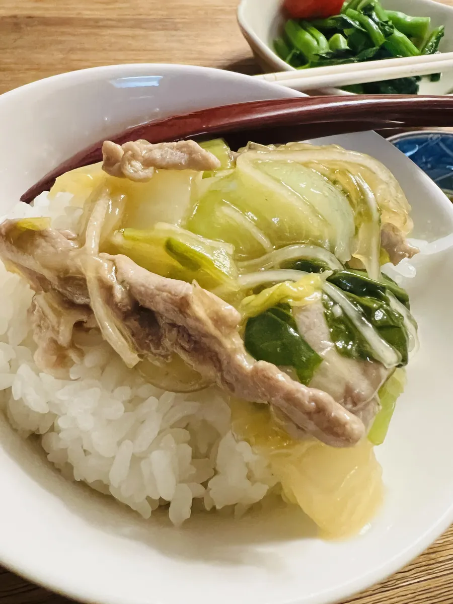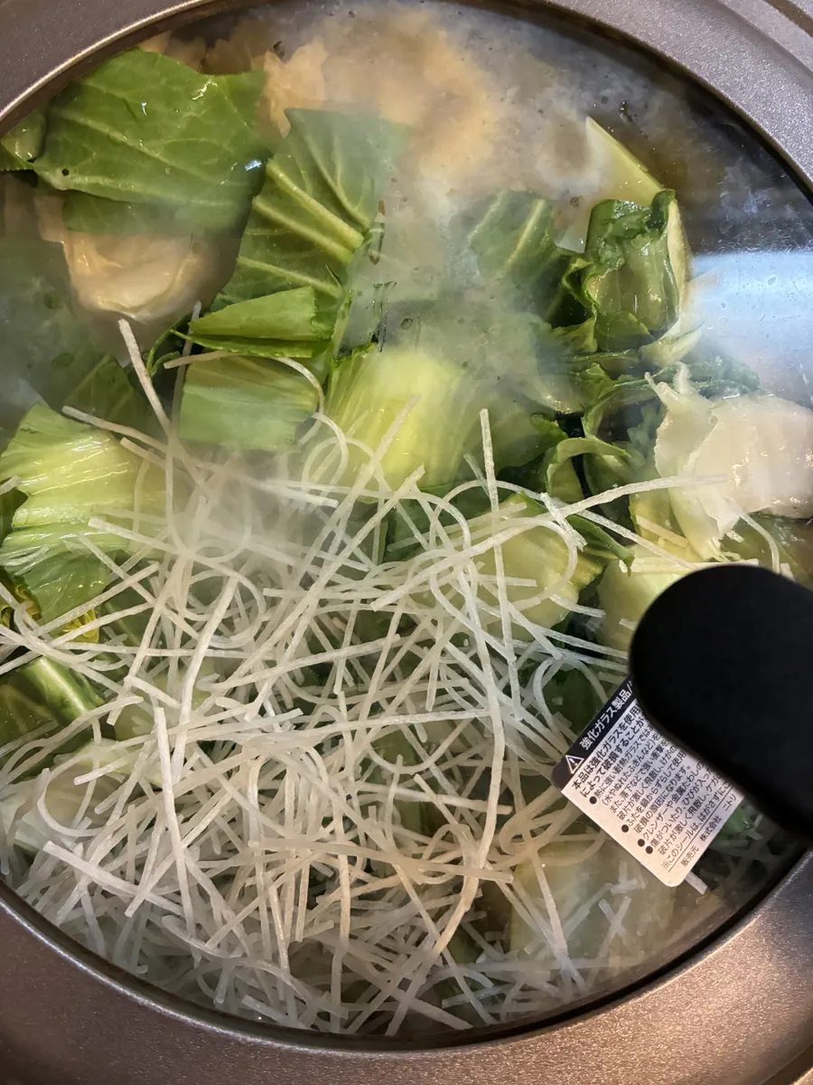 ②白菜と水を加えてフタをして5〜6分ほど煮る。