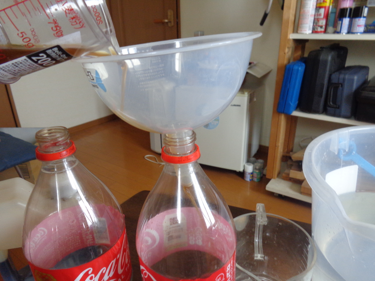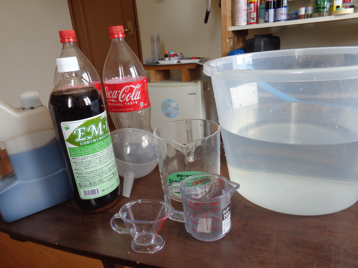 用意する材料はEM1というEMの原液、それと糖蜜です。道具はバケツにぬるま湯。軽量カップ、漏斗とペットボトルです。EM1や糖蜜はネットで調べればお近くに販売店があるはずです。