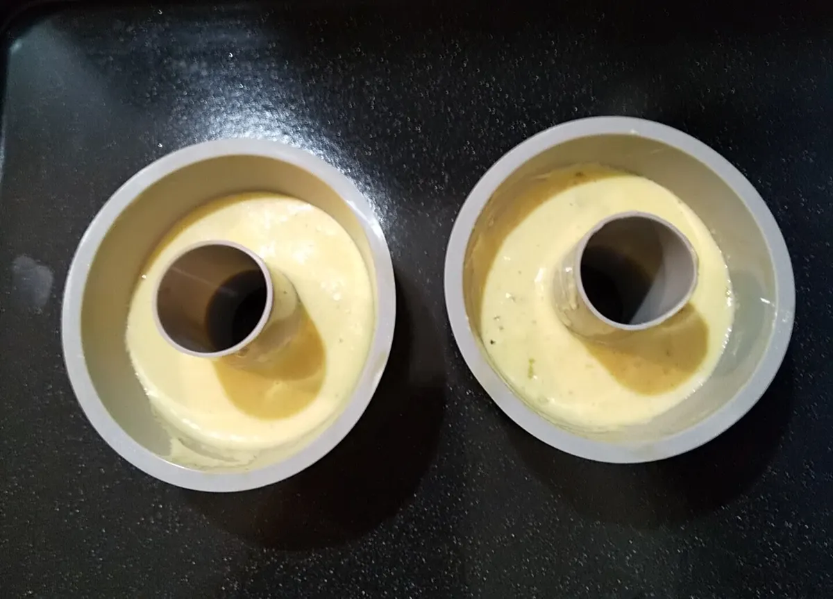 ⑦セリアの口径10cmのシフォンケーキの型に入れる ![]() 上から落として、空気を抜いておく |