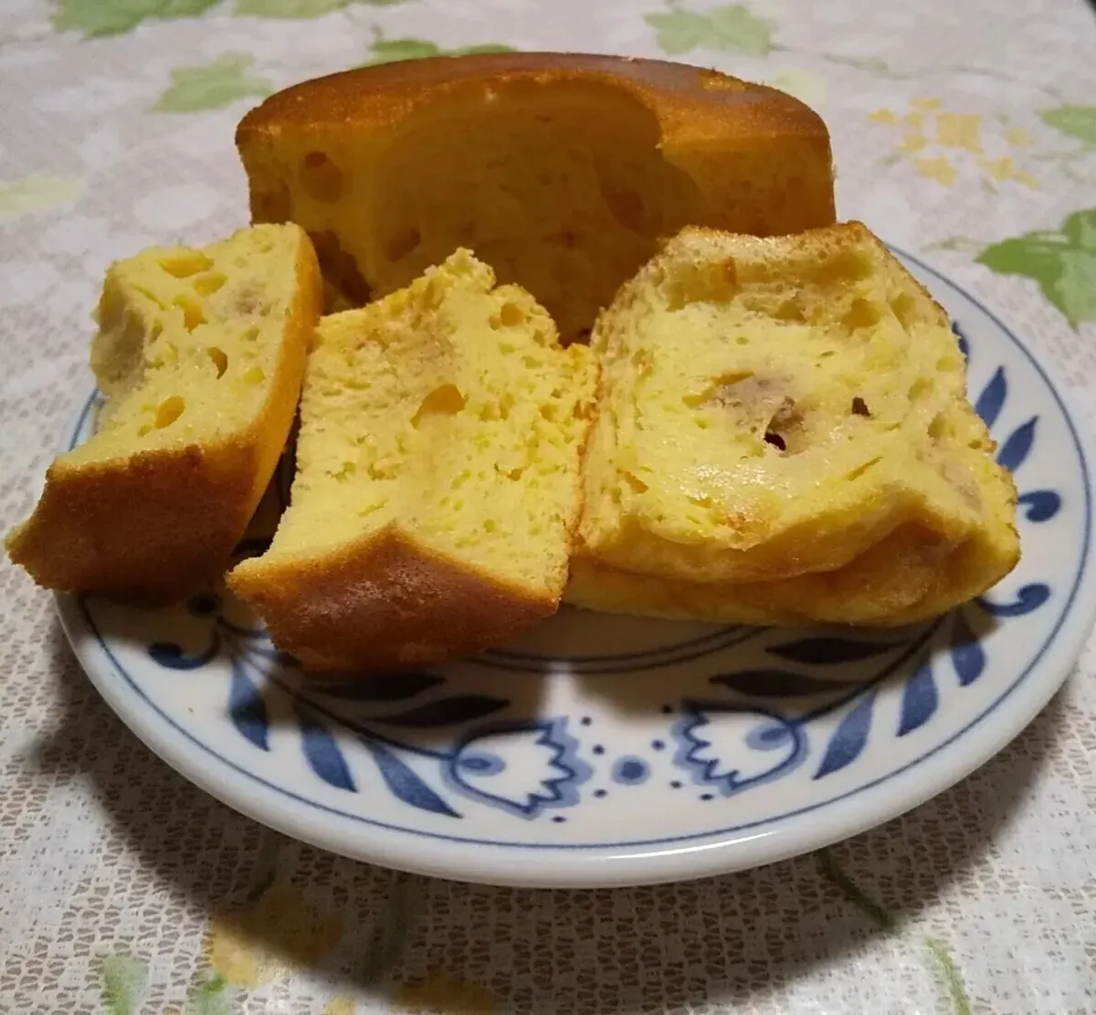シフォンケーキの左側の型だけに、胡桃を入れてみました。 |