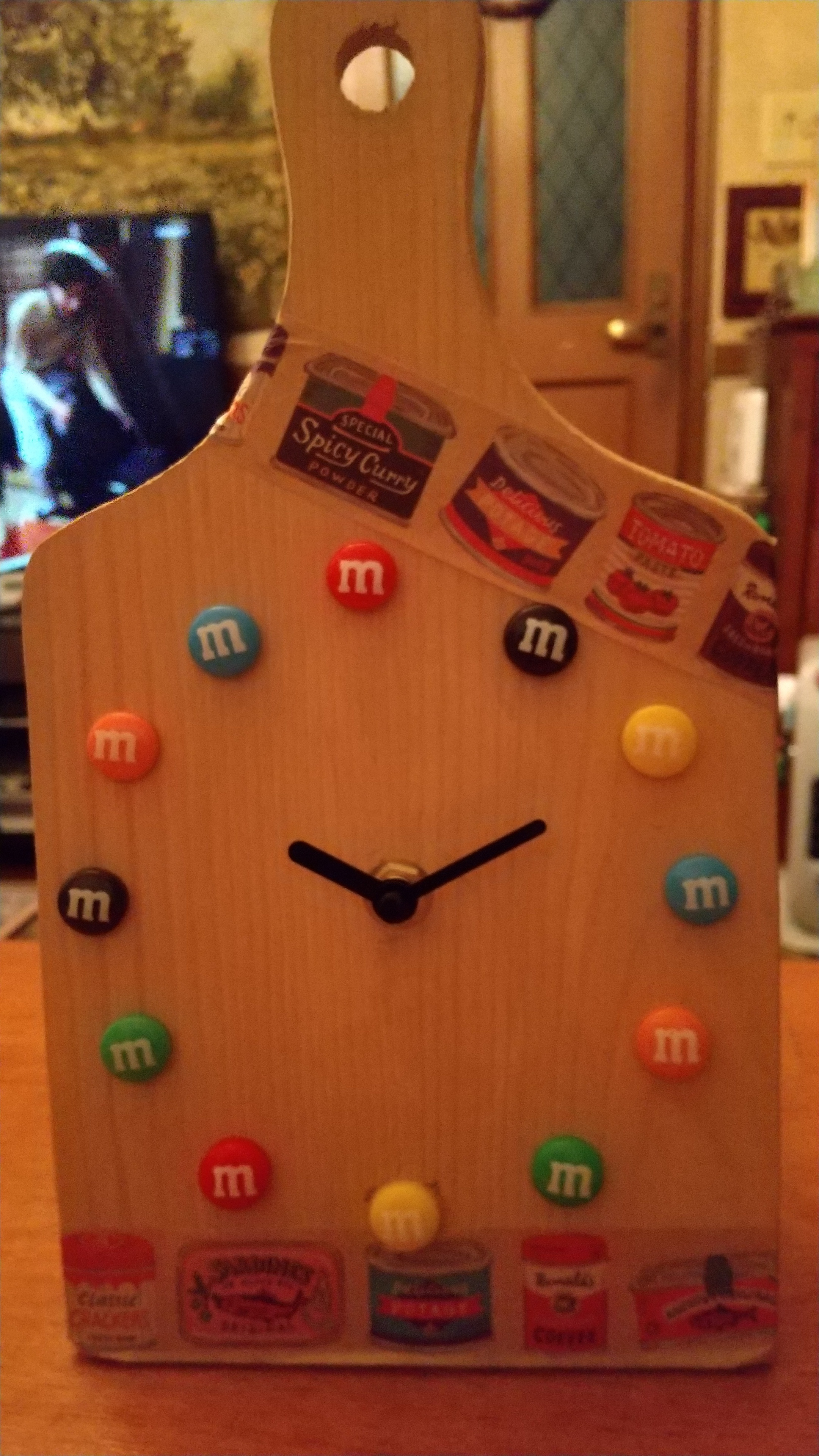 投稿を表示クッキングボードのような板にM&Mもどき?の文字盤。遊び心満載で可愛らしい時計ですね🕰✨。
