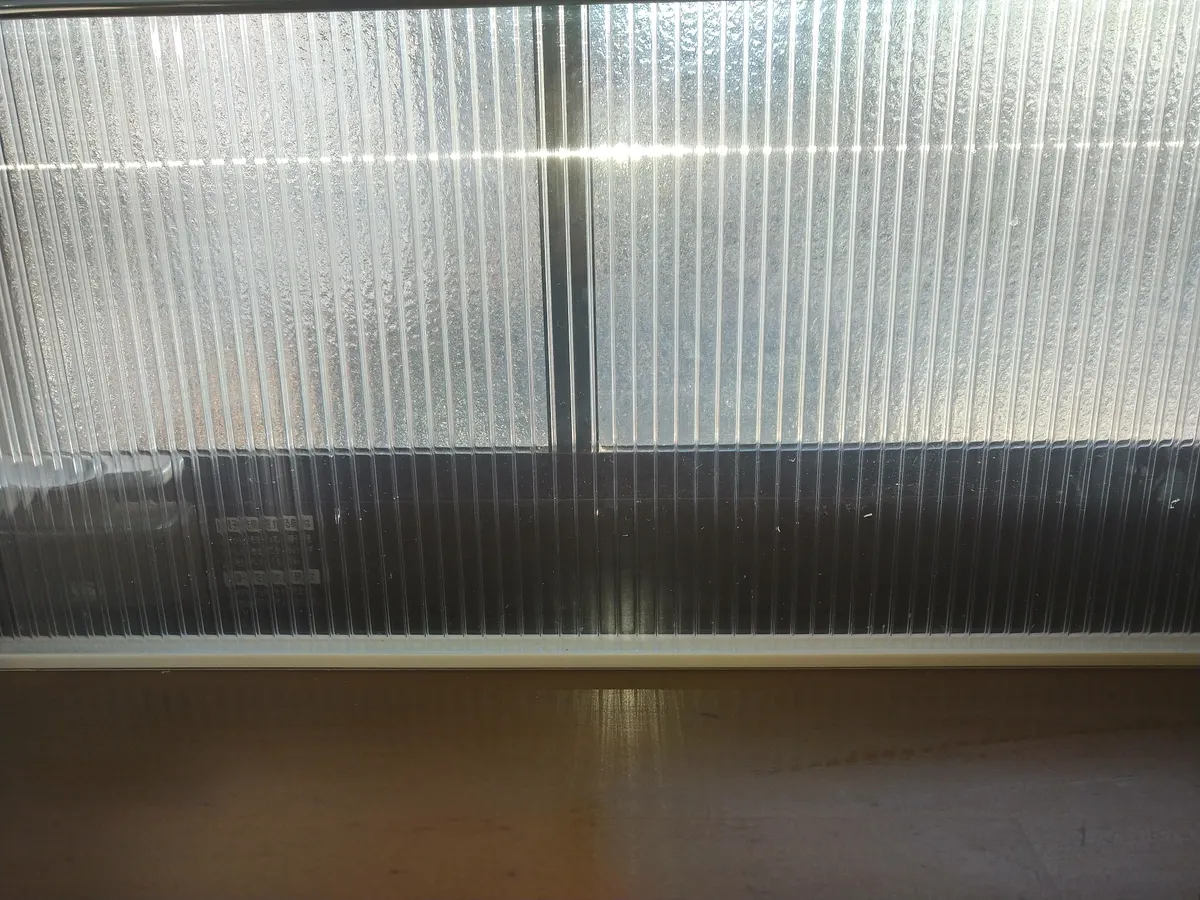 配線モールを両面テープで取り付けて、ポリカ板をはめ込みました。先に窓枠にはマスキングテープを貼って、のりが残らないようにしてあります。