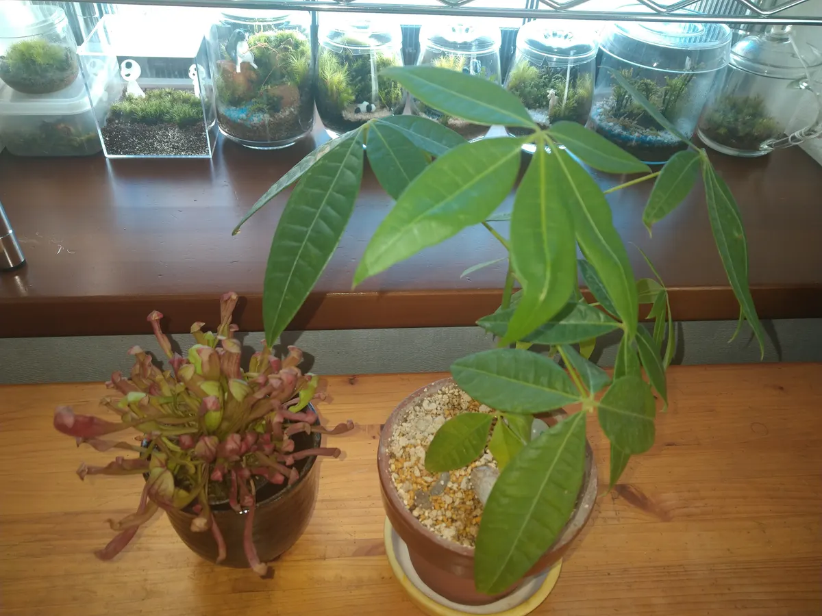 ダイソーパキラと最近ハマっている食虫植物(サラセニア)です☺️元気に育ってます!