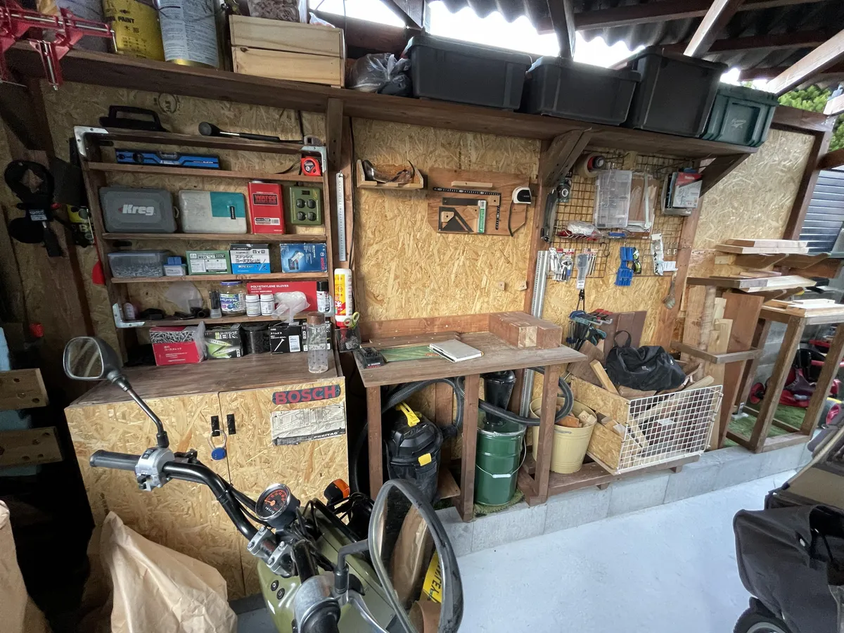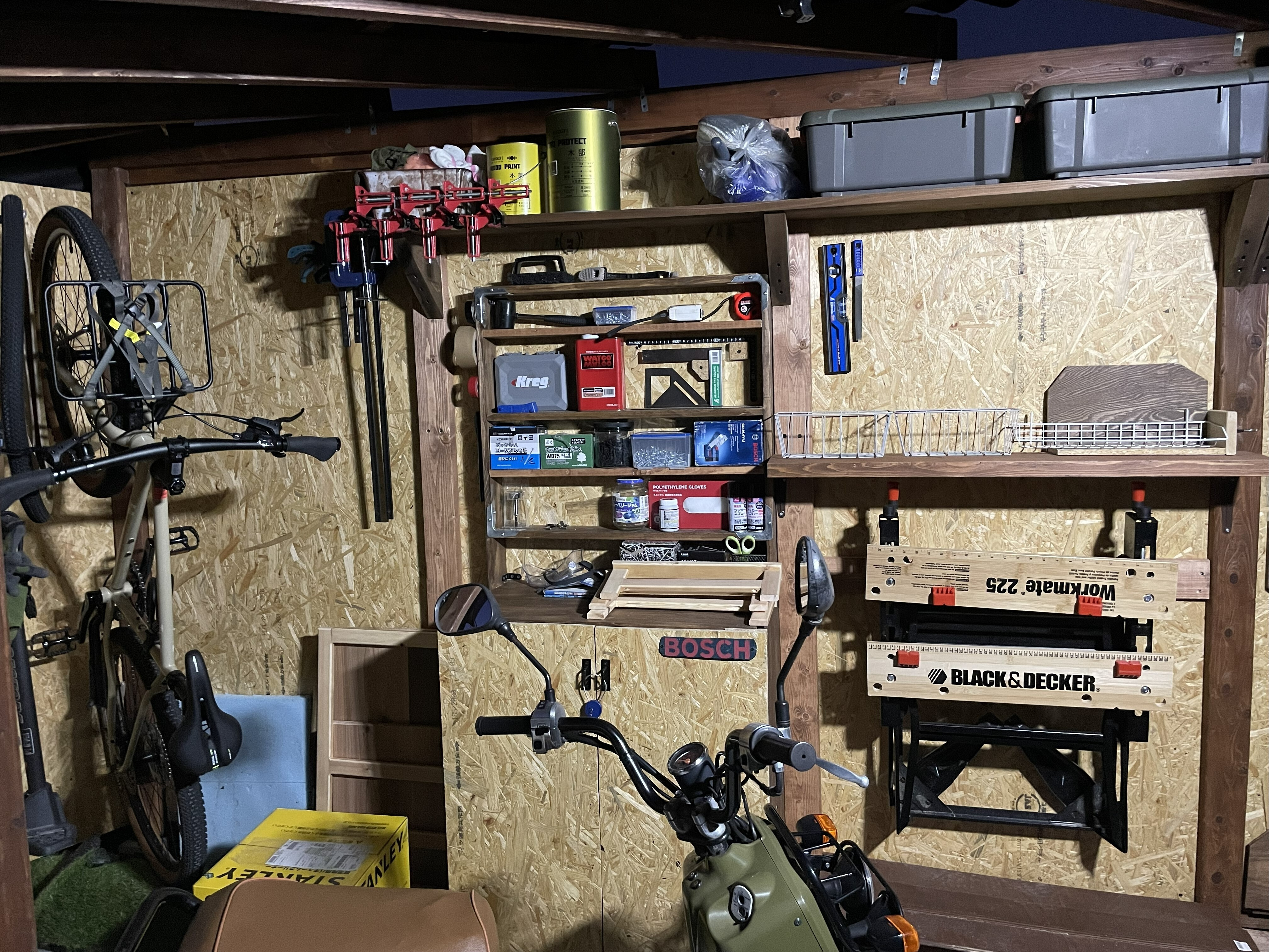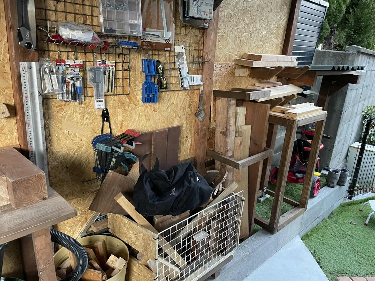 端材も整理しなきゃと端材置き場作った(右側)のですがぐちゃぐちゃですね笑