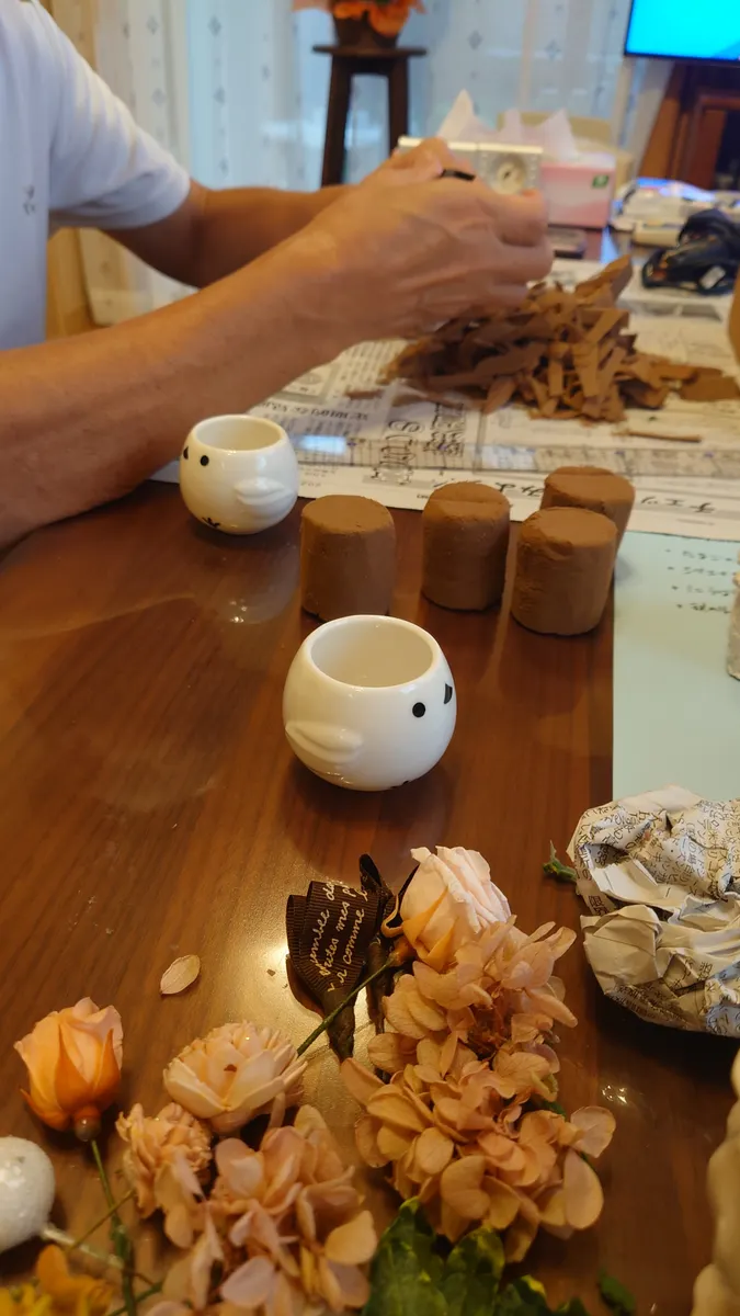 ↑シマエナガにフォームをセット 娘依頼のマルシェ出品作品なので、旦那もフォームを丸くカットして器に入れる内職をしてくれました(笑)