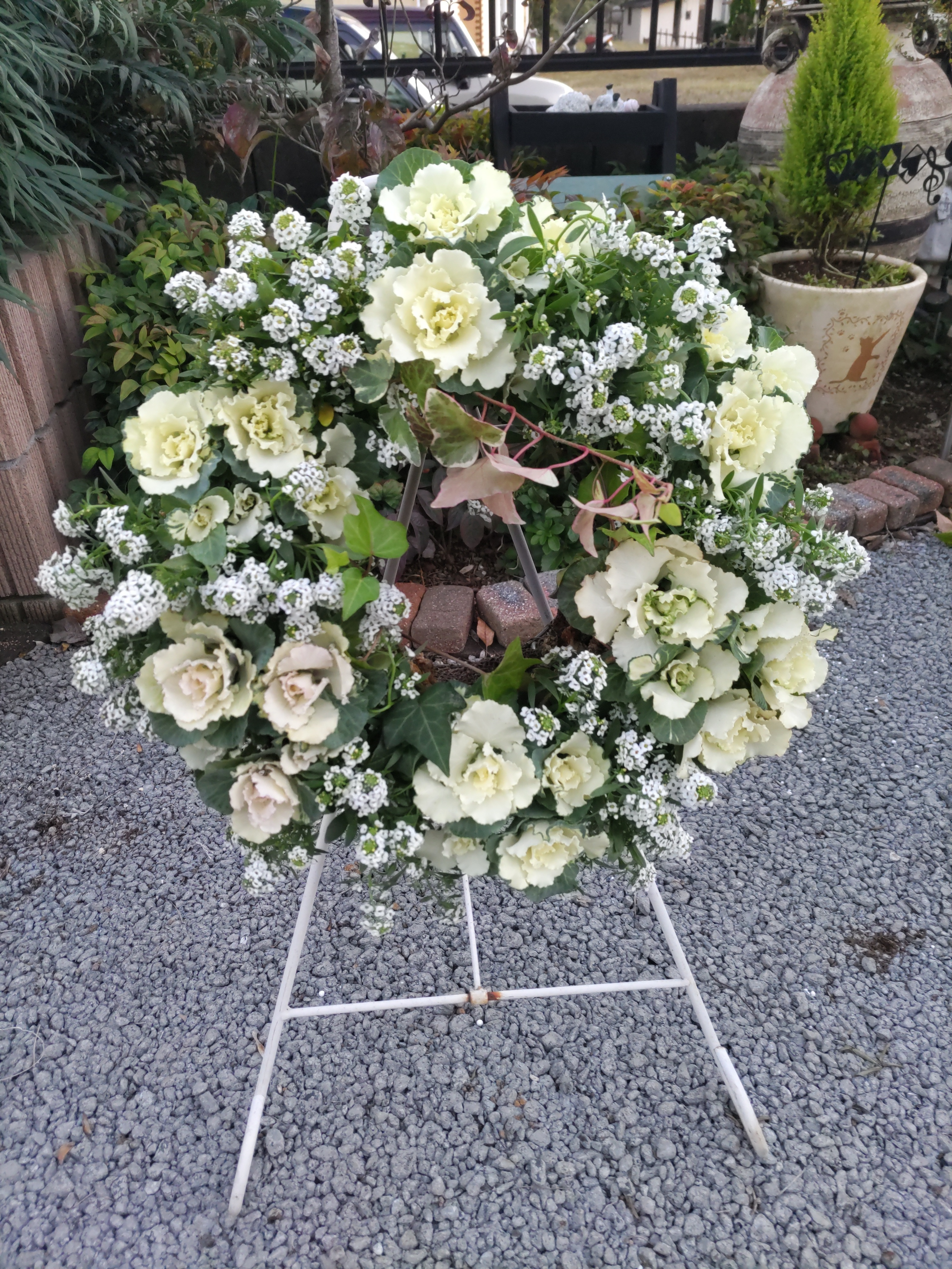 投稿を表示白の葉牡丹がバラの花びらのようで素敵な使い方ですね😍 オアシスでなく土を入れたリースですよね!?