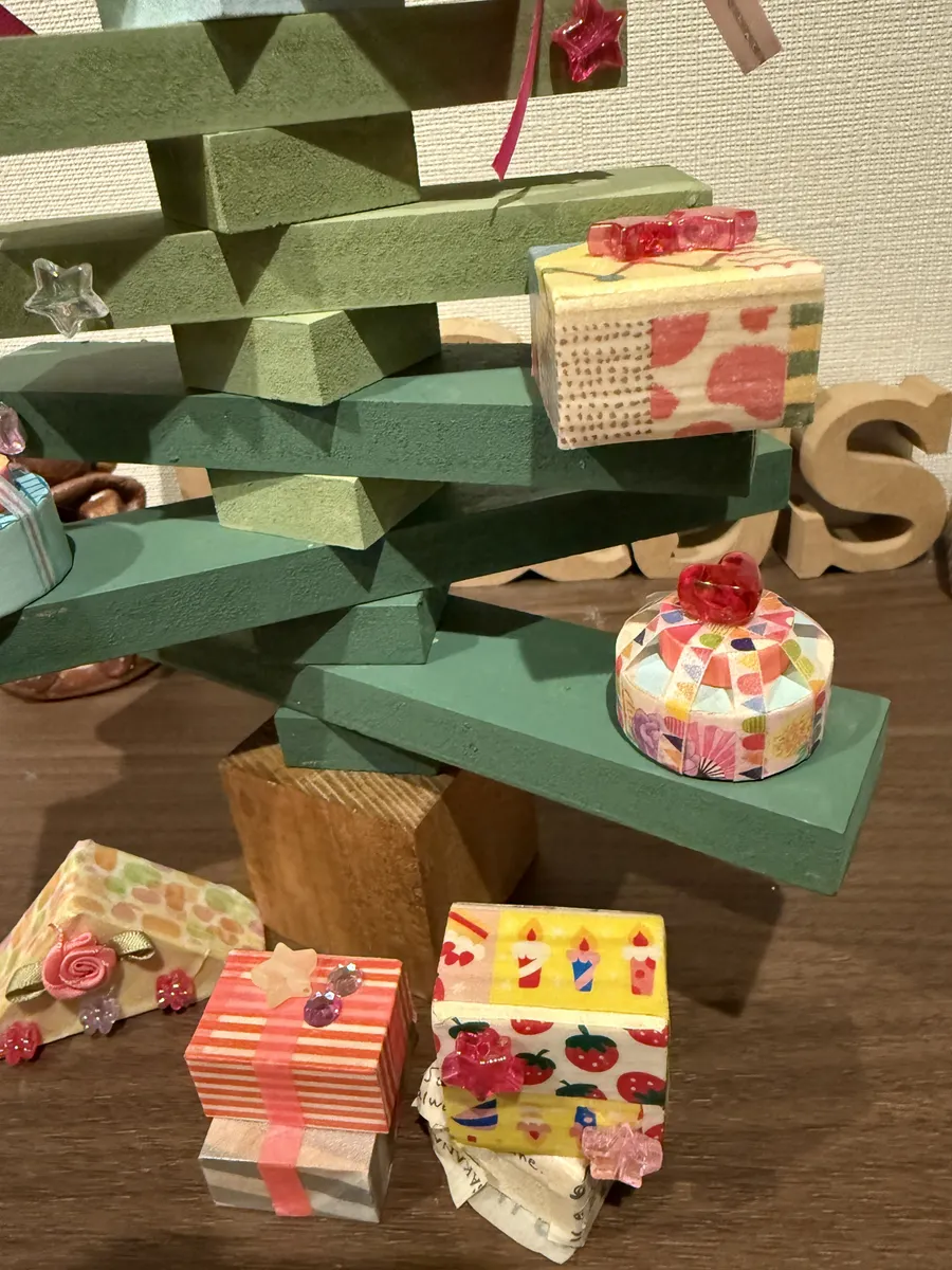 枝?が動くようになっているので、プレゼントがのるように大きさを考えて小さい廃材を選んでマステでまきました。