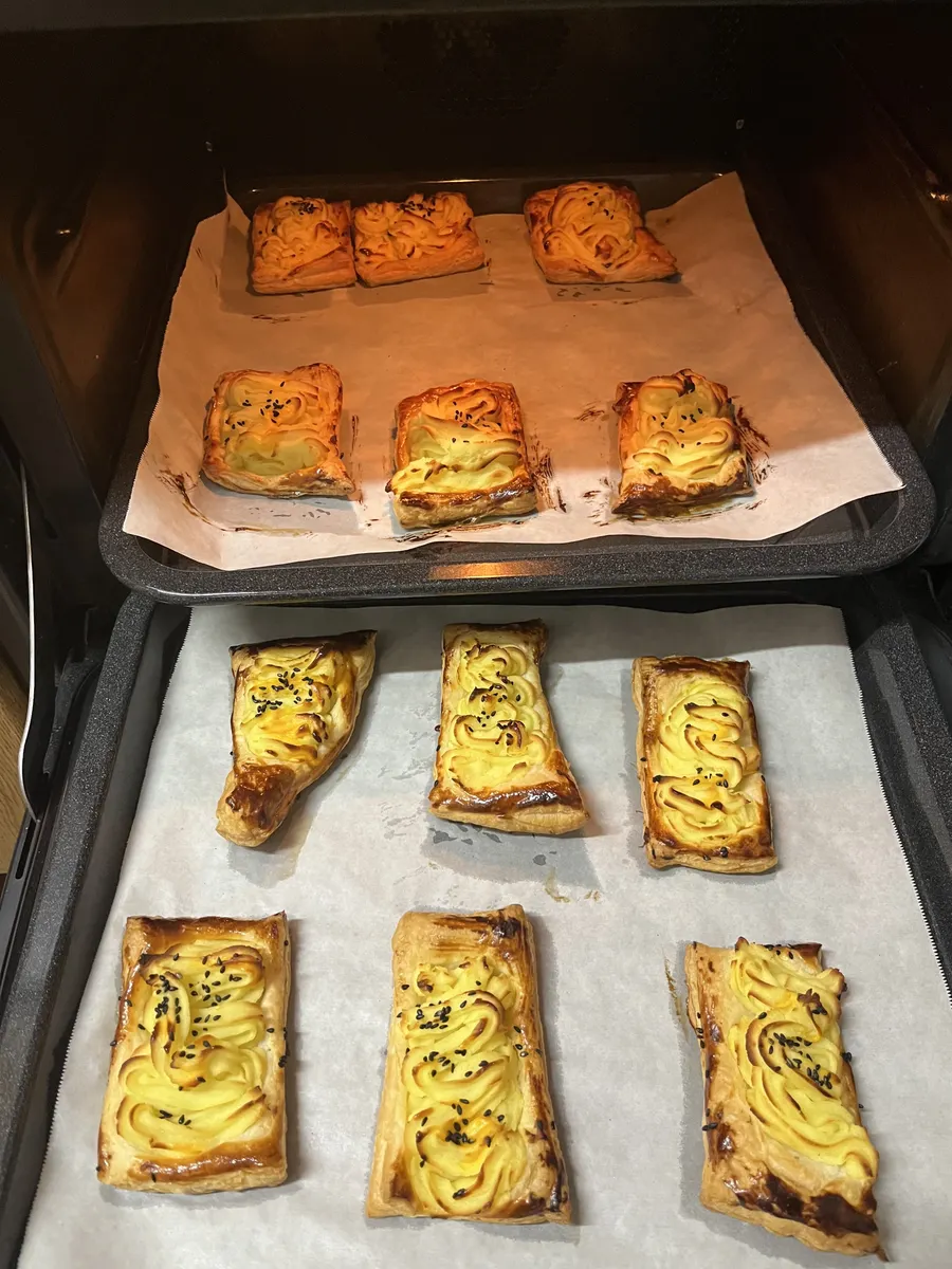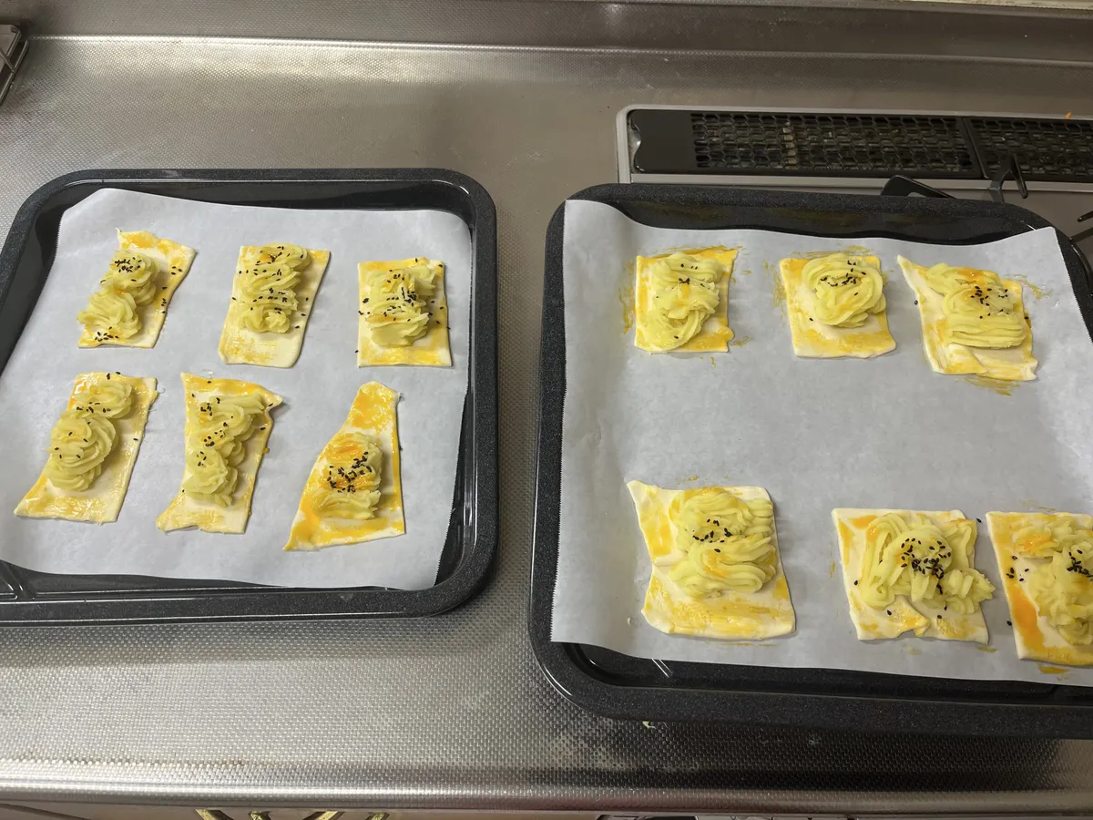 パイ生地も残りが少ないので土台の上にペーストを乗せて上には生地をかぶせずに焼きました。