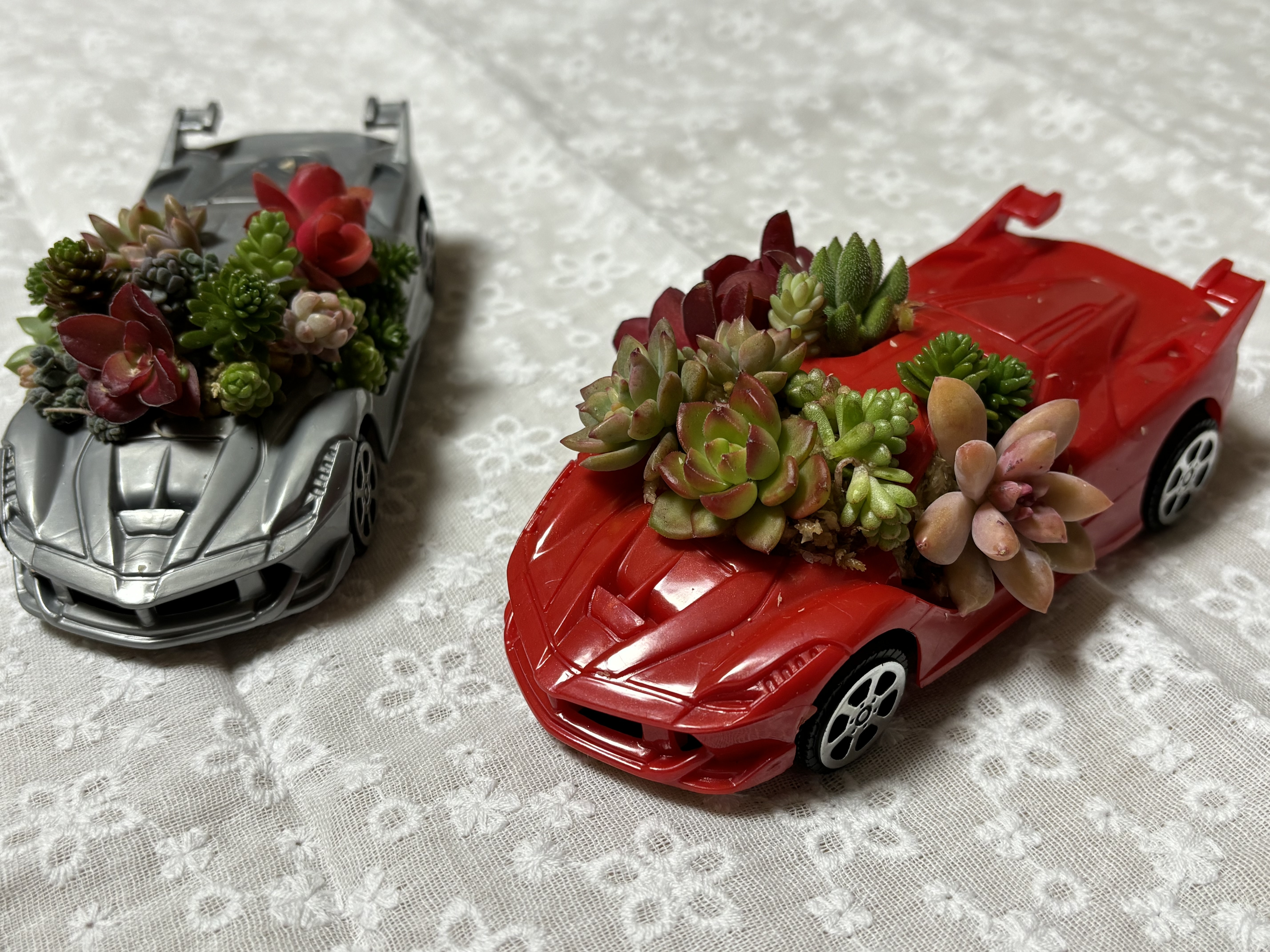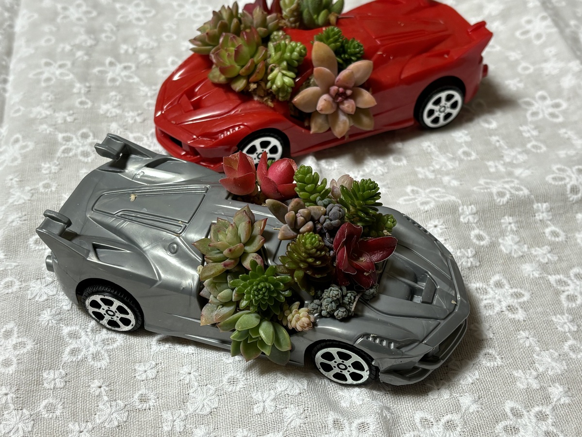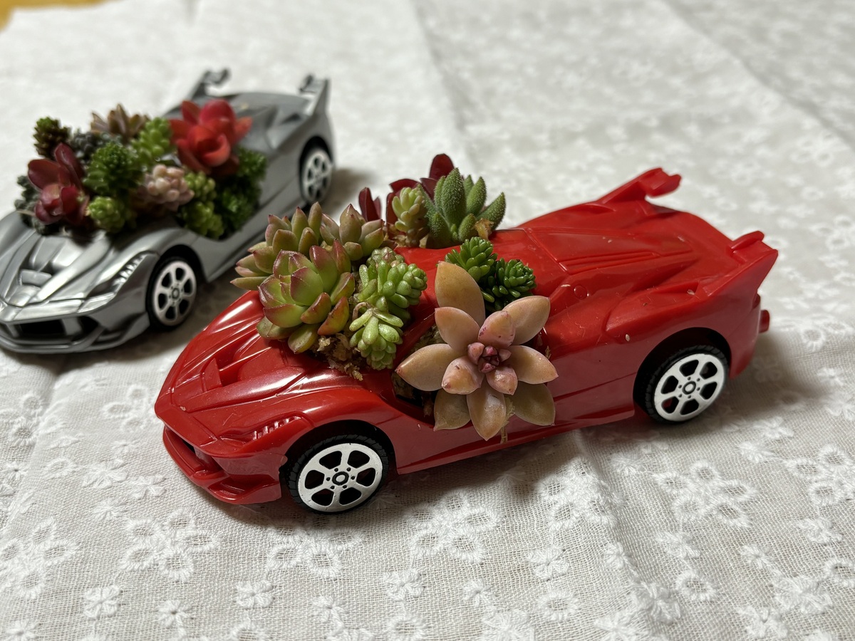 息子がもう使わない車のオモチャが沢山あるから多肉ちゃん入れてみたくなりました✨