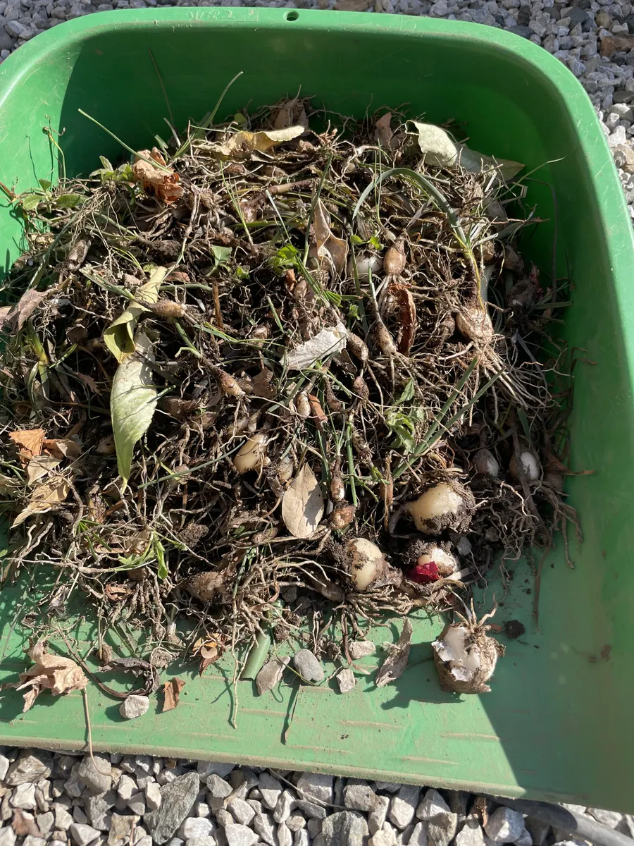 初夏には、Copper lily(リンク→ https://diy-square.cainz.com/announcements/bpjnnhmoatyxcdxv )のような可愛い花も咲いてますが、もちろん私が球根を仕込んでる訳もなく、きっと鳥の仕業から始まってのことなんでしょうけど、どうもすっきりしないので、試しに掘り上げてみたら、すごい量の球根が!