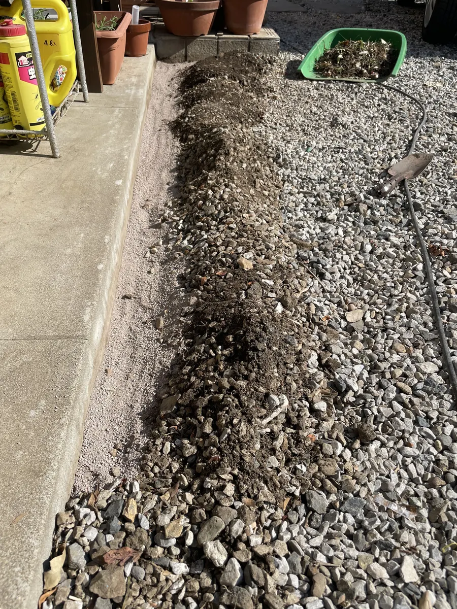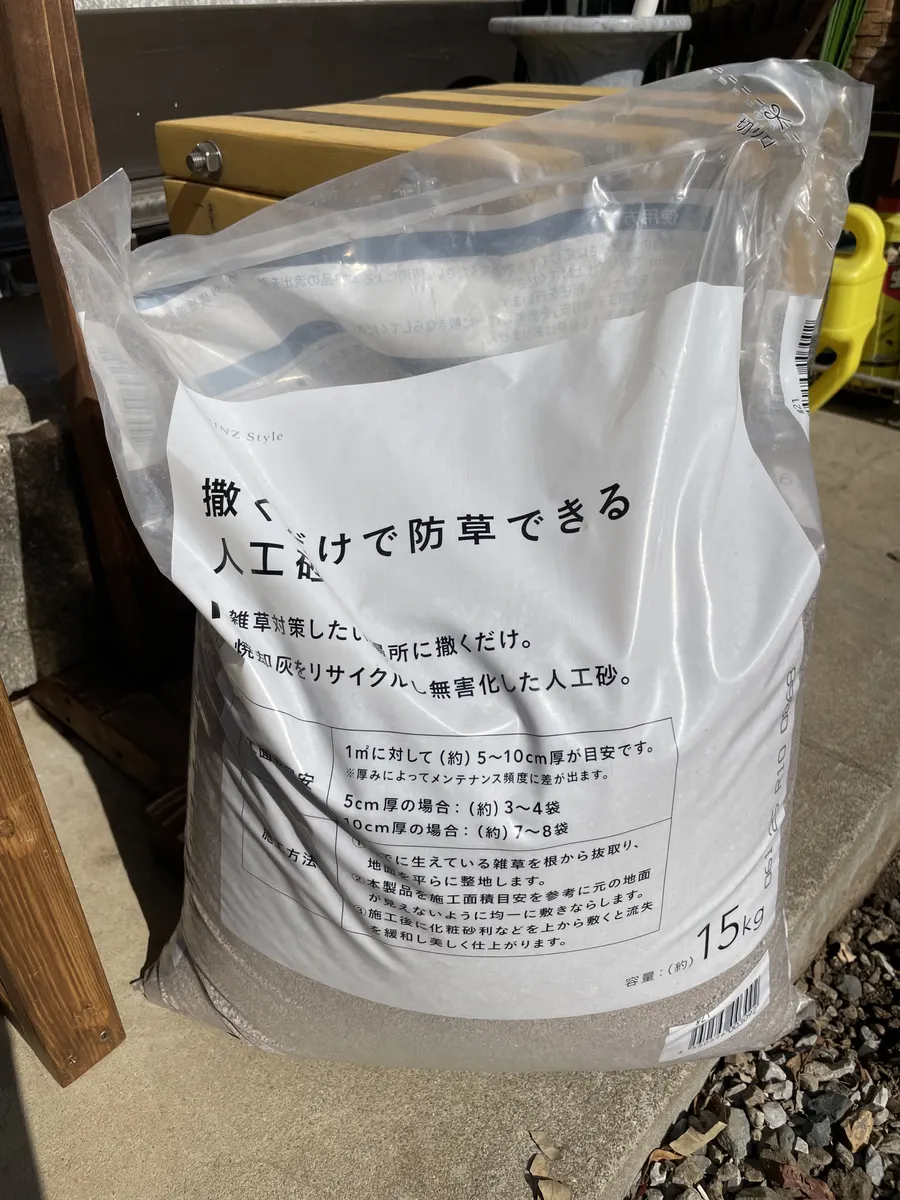 掘り上げてしまった以上、中途半端にできないので、人工砂を仕込んで防草を施しました。