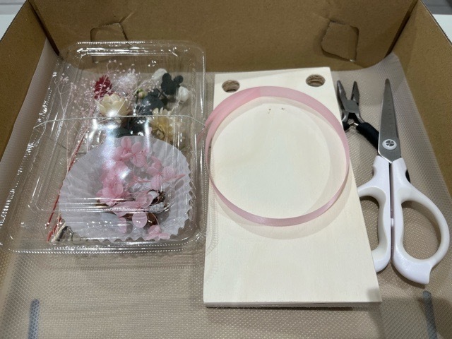 土台にホワイトを塗りドライフラワーをアレンジして飾りました。