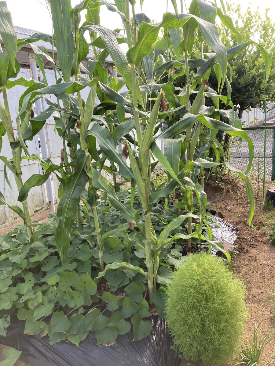 僕は今、とても喜んでいます。サツマイモとトウモロコシのコラボレーション栽培。これはいいですね。しかも、美味しそうなサツマイモ。品種は何かなぁ?紅はるか?