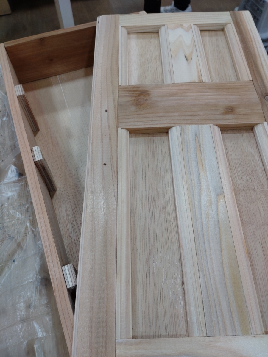 トップ > DIY > インテリア > ドアキャビネット🚪 ちょこっぺ 2023/02/11 21:31 ドアキャビネット🚪 人気の講座ですが、頑張って予約をとったドアキャビネット🚪を作ってきました。 塗装前です😊トリマーでドアの周囲を加工するのですが、躊躇しちゃうと上手くできないし、なかなかコツを掴むのが難しかったです😖。 色は無難にウォルナットにしました😊。 : 何人かの方がこちらで投稿していましたが、やはりドアを開けると前に倒れますね😅重いものを入れたら倒れませんが、キャビネット本体に厚みがないのであまり入れられないし‥‥なにか良い方法があったら教えて下さい🙋 : でも、とってもかわいいドア🚪です😊 いいね 共有する 共有する X LINE リンクをコピー コメントする 4 件の返信 (新着順) ミュートしたユーザーの投稿です。 投稿を表示 Lulu 2023/02/12 16:47 バランスが問題でアレンジ必須❓なんですね🤔今日いつもの店舗のWSだったのでリクエストしちゃいました😆💕 作れます様に🙏 いいね 返信する ミュートしたユーザーの投稿です。 投稿を表示 ちょこっぺ 2023/02/12 18:04 昨日、いらっしゃるかと思いました😊バランスと言うか、構造上、本体の厚みに対して扉が大きいから仕方ないのだとおもいます いいね 返信する ミュートしたユーザーの投稿です。 投稿を表示 あにー 2023/02/12 07:45 本体底に薄い板でスリッパみたいにかませたらどうでしょう? 適当な写真が無いですがウォールラックみたいに(邪魔になるかもしれませんがかわいくアレンジ出来ると良いですね)前庭?みたいな感じで… いいね 返信する ミュートしたユーザーの投稿です。 投稿を表示 ちょこっぺ 2023/02/12 07:57 私もそう思って端材コーナーをみてきたのですが、適当なモノがありませんでした😅 いいね 返信する ミュートしたユーザーの投稿です。 投稿を表示 源 2023/02/12 07:38 お疲れ様♪ 素敵ですね! 周りだけトリマー掛けなんですねドア🚪開けると物入れなんですね。 こっちでもやって欲しいですね。 いいね 返信する ミュートしたユーザーの投稿です。 投稿を表示 ちょこっぺ 2023/02/12 07:58 まだ開催している店舗、少ないんですかね⁉️ いいね 返信する ミュートしたユーザーの投稿です。 投稿を表示 ふきふき 2023/02/12 05:37 素敵ですね~ドアキャビネットを希望です~メモメモ🤗 いいね 返信する ミュートしたユーザーの投稿です。 投稿を表示 ちょこっぺ 2023/02/12 07:59 お近くの店舗で開催されると良いですね😊 いいね 返信する