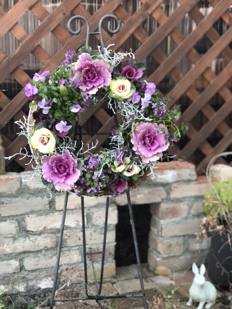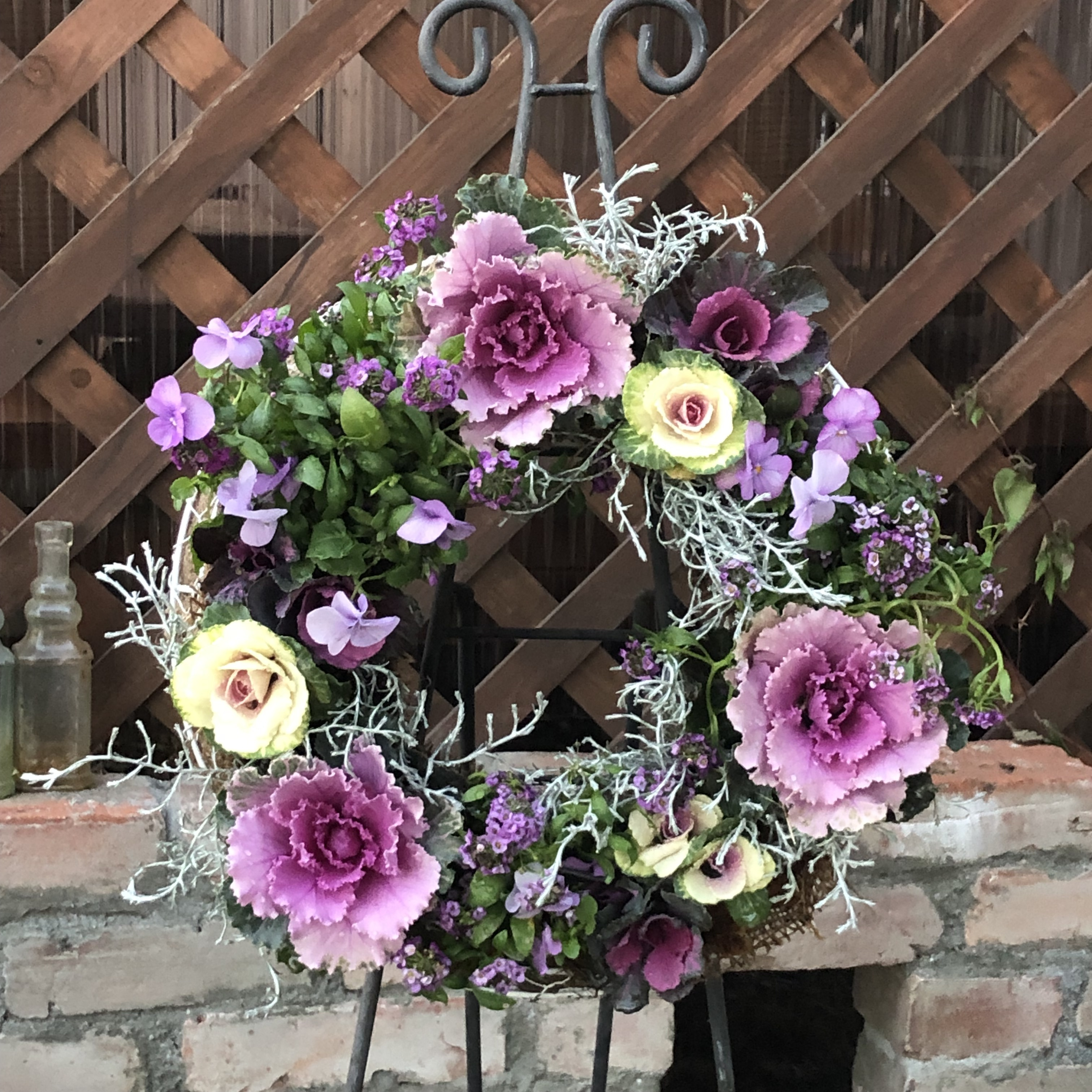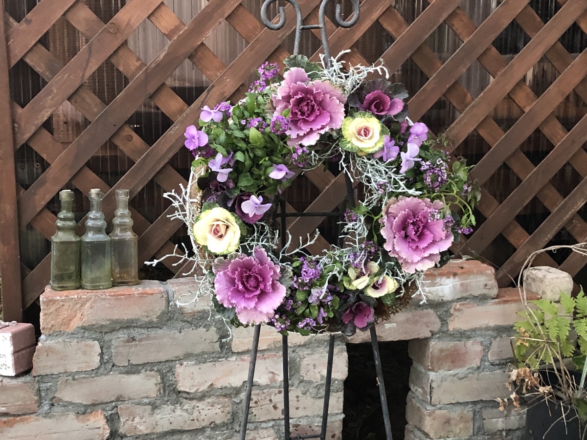 昨年ハボタンとビオラのリングリースをWSで作ったんですがかける所がなくて😭