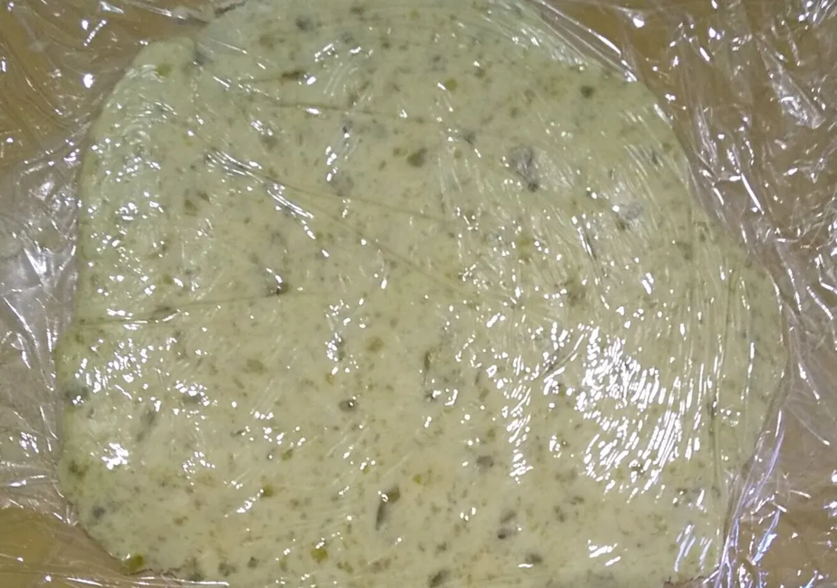 ②一塊にし、ラップで挟み、5㎜に伸ばし、冷蔵庫で30分冷やす ![]() |