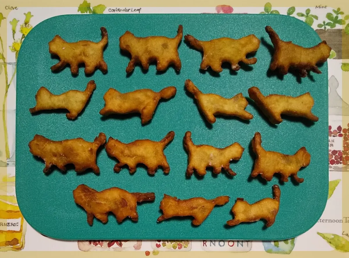 ④170℃のサラダ油できつね色まで揚げる 🐈️型は、2種類ですが、個性的な猫ニャンに焼き上がりました😅 ![]() 生地を利用して猫ニャンにも🤎を😻 ![]() |