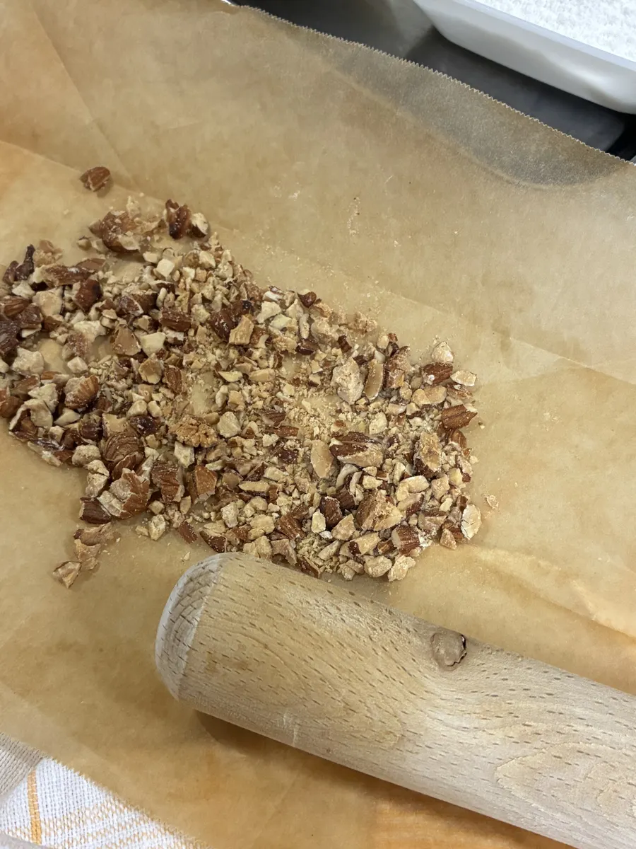 ホールアーモンドを指定の温度に設定したオーブンでローストし、ガシガシ叩いて荒目に砕く‼️