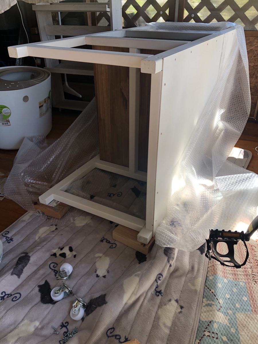 レンジラック、作ってから1週間の時を経て、ようやく母屋(正確にはベランダ)にやってきました〜。