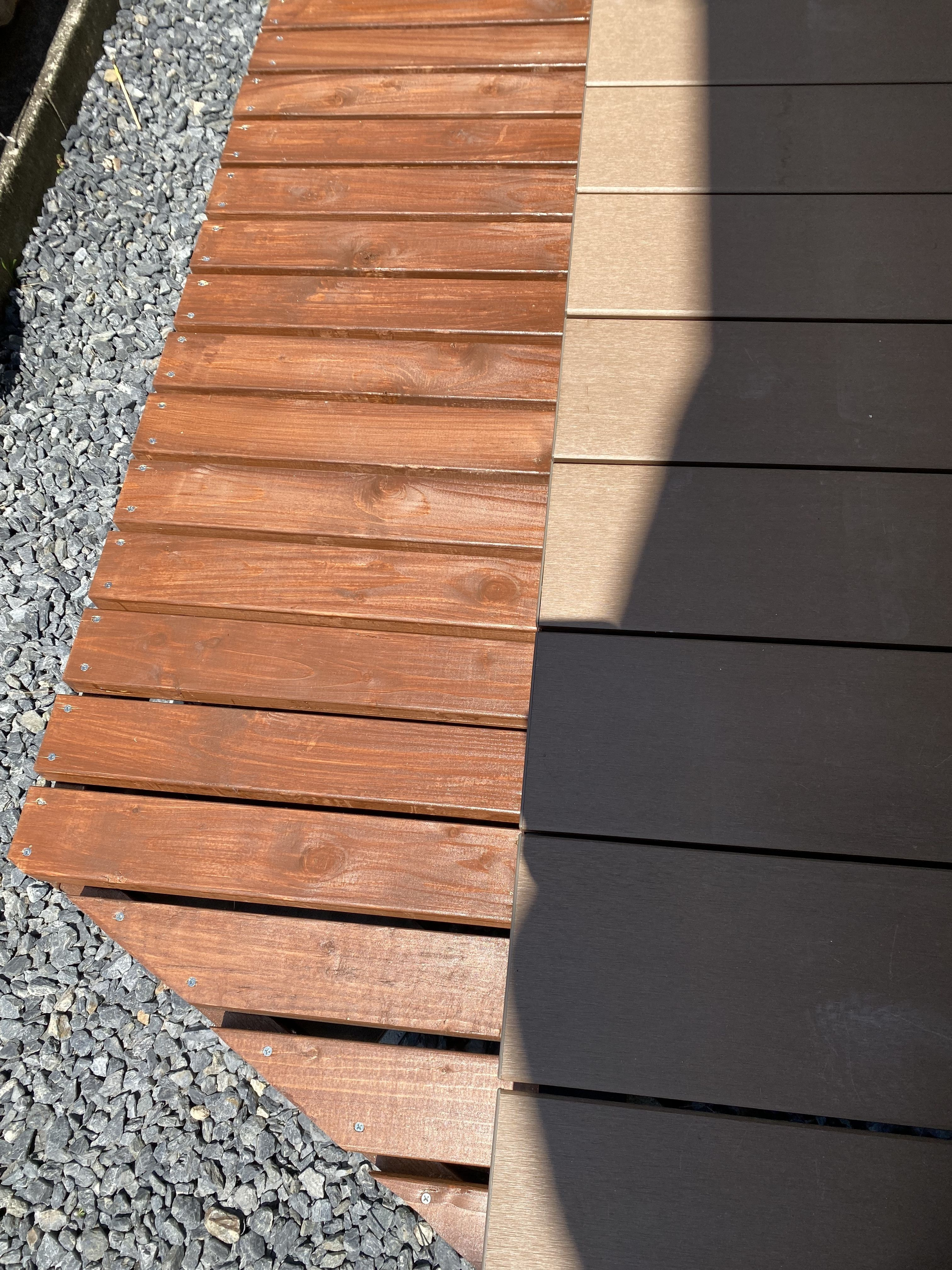 カインズで購入した人工木デッキにプラスして2×4材でウッドデッキをDIYしました。