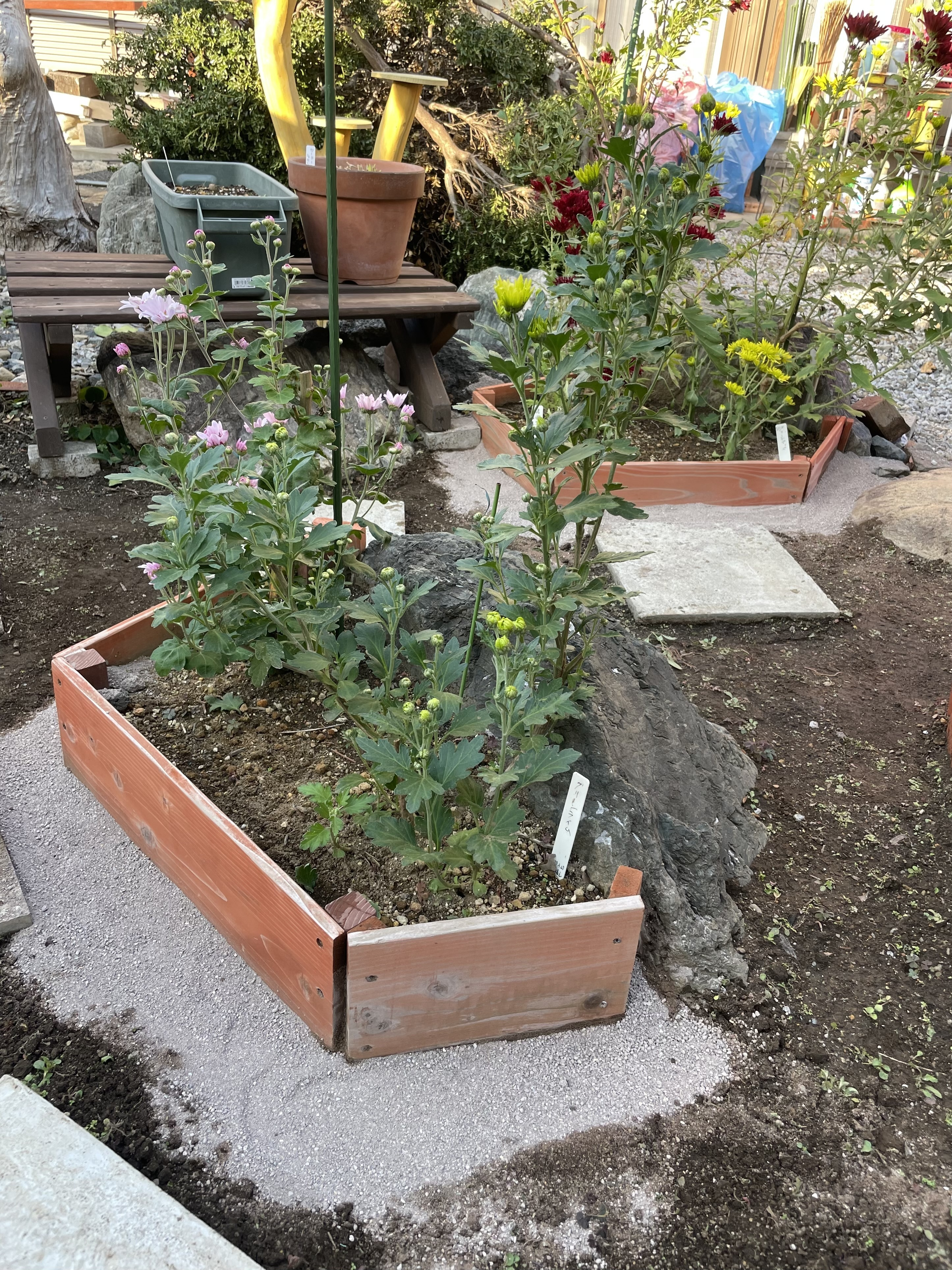 小菊の小花壇2個の周りを人工砂で囲む