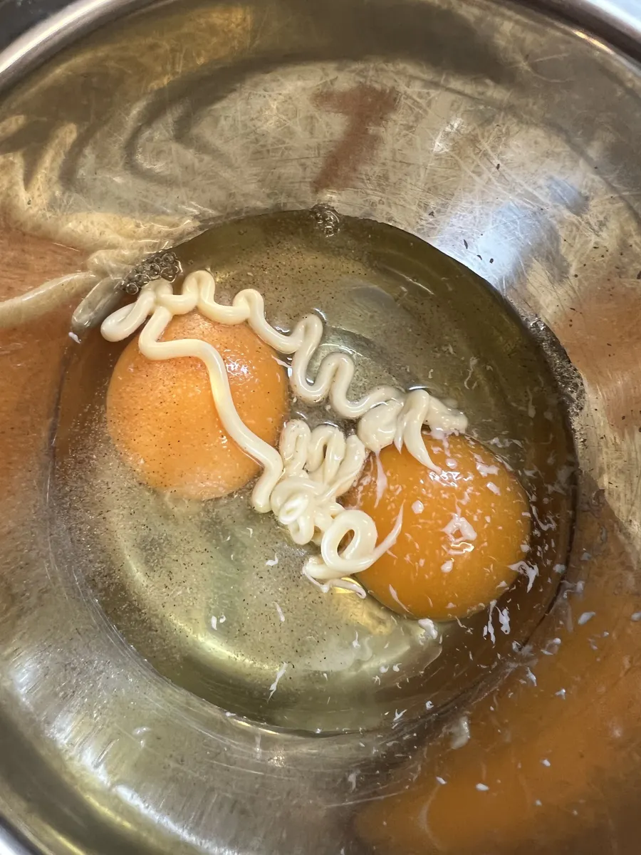 ②ボウルに玉子を割り、マヨネーズ小さじ1くらい入れて混ぜておく。