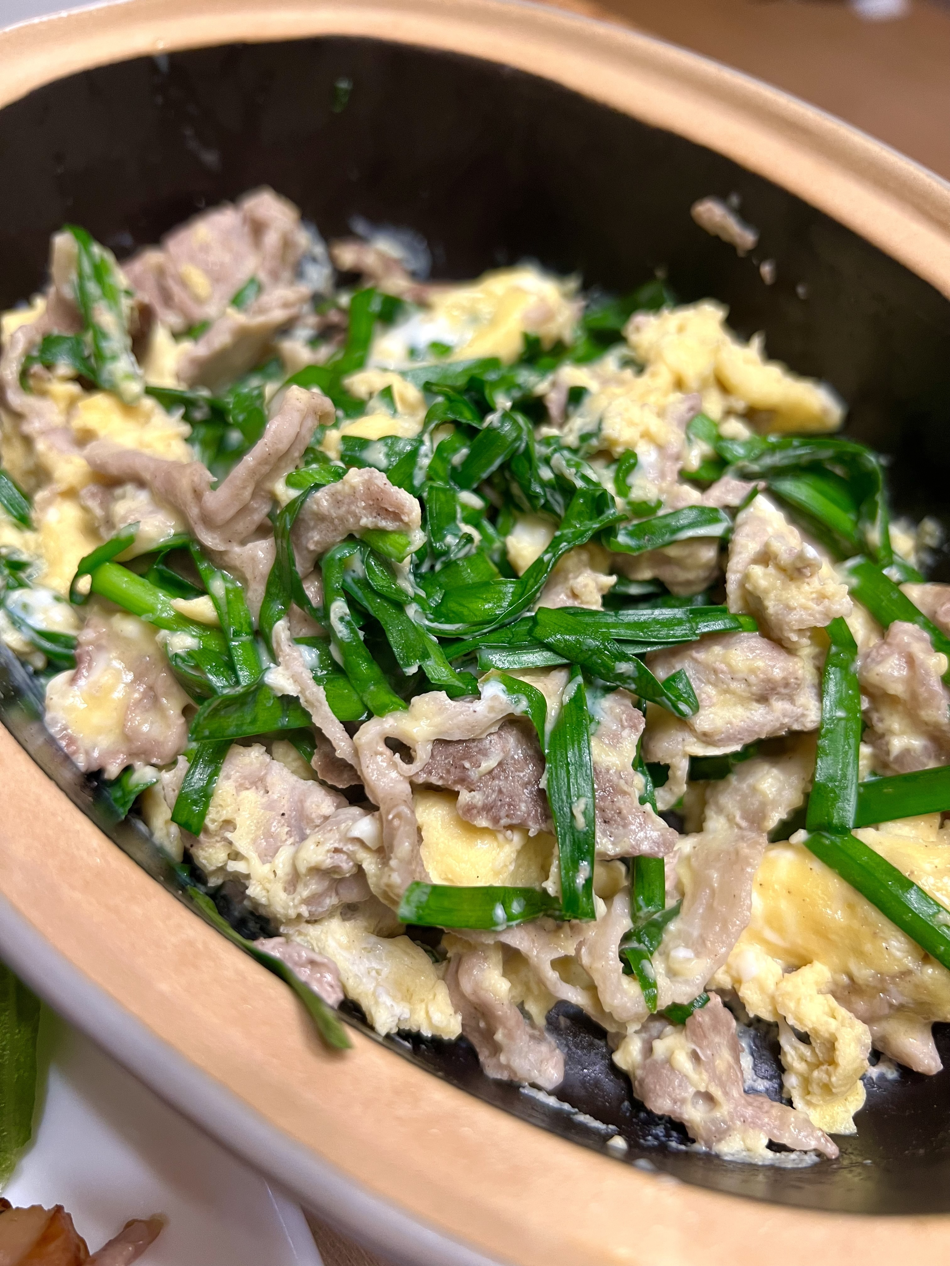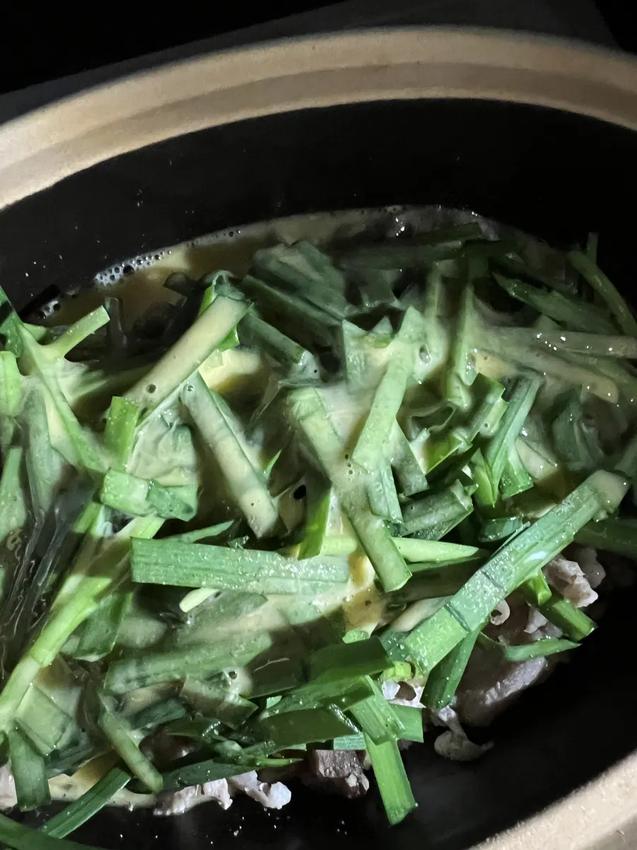 ③①の肉の上にニラを並べて、玉子を流し入れて2分加熱し、一度取り出してかき混ぜる。
