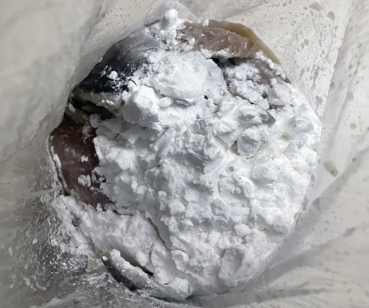 レンチン加熱してるのと同時進行で、材料①の下処理済みのアジフライ用鯵を調味料①の片栗粉以外を入れたビニール袋に浸けておき、暫く置いた後下味が付いたら片栗粉を入れて混ぜたら素早く揚げるぅ〜🐟➰🍳⛽️🔥🔜‼️💨✨