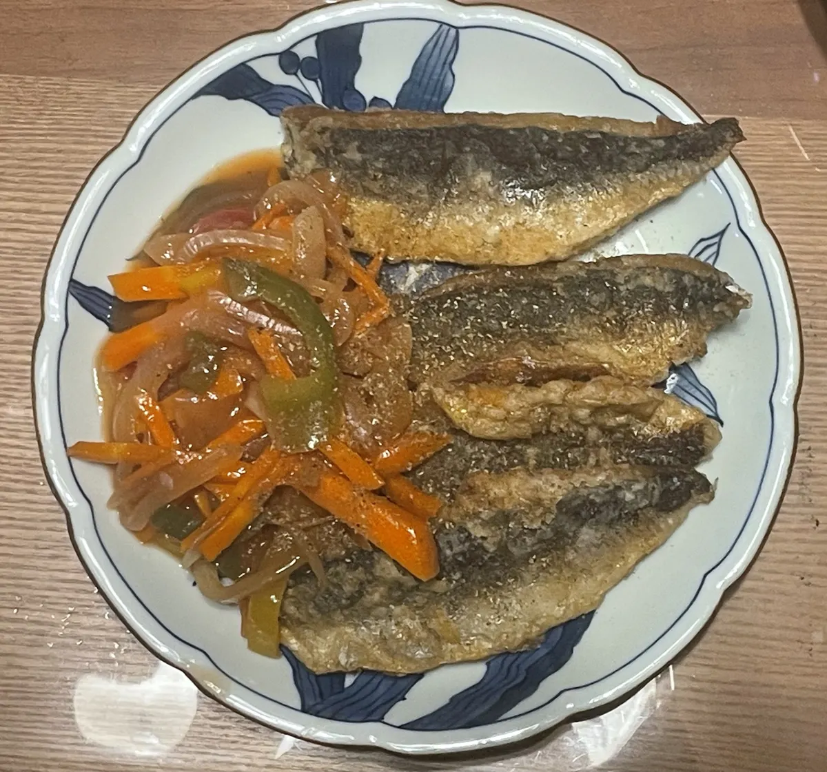 鯵フライ用の下ろして骨も付いてない状態の物を半額で買ったの溜まってたから、唐揚げにしてお野菜の甘酢餡掛けにして食べることにしたよぉ〜😆🙌🐟🧅🥕🫑✨