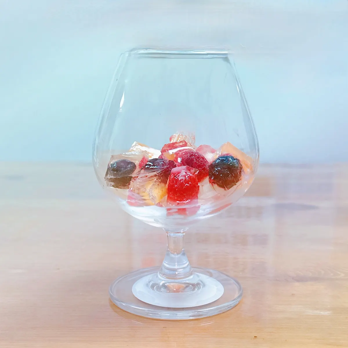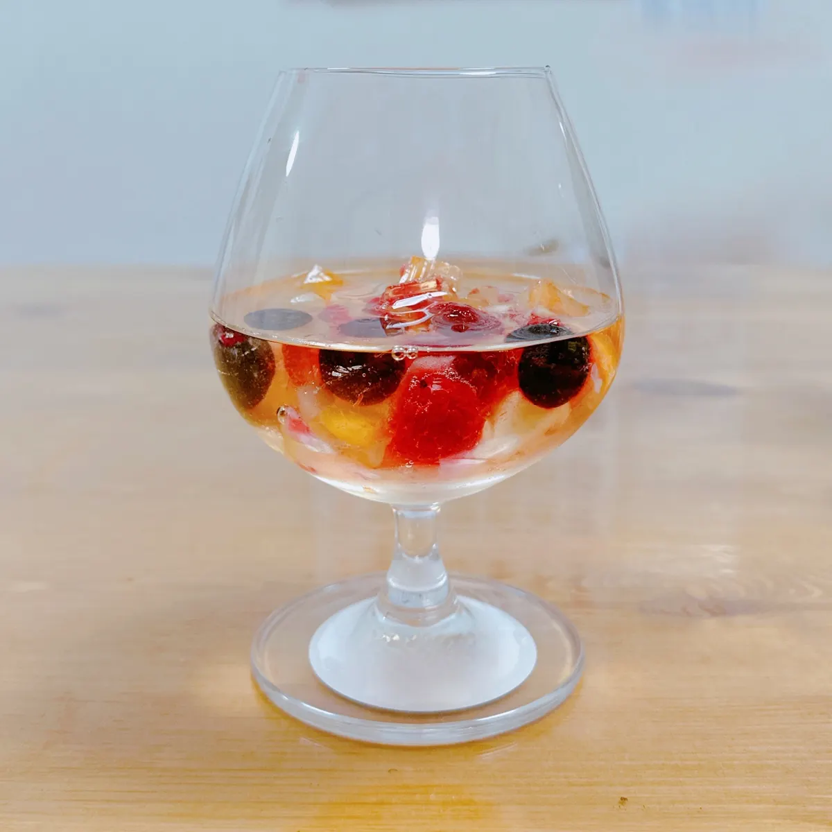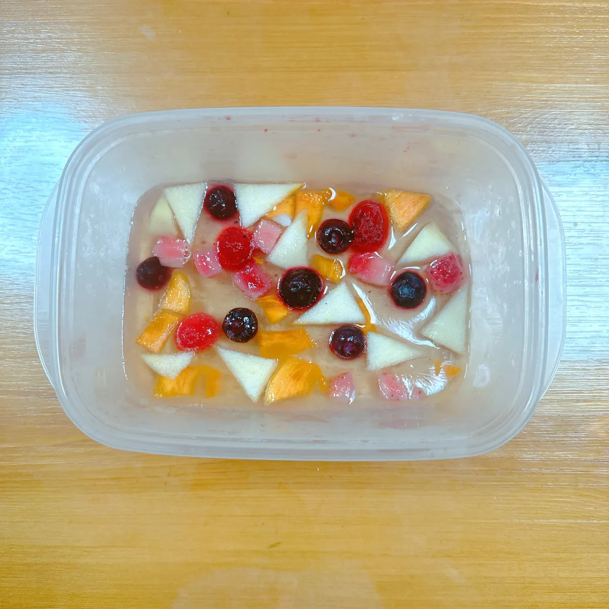 2、人肌に冷ましたら、容器に入れたフルーツにゼリー液を入れ、冷蔵庫で固める。