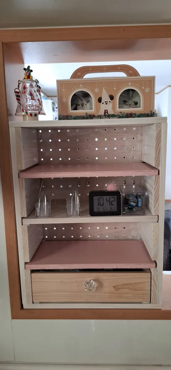 トップ > DIYアワード2025 > キャンペーン > 高さ自由ラック カスタマイズ っぺ 2025/10/05 11:48 高さ自由ラック カスタマイズ ■作品内容 高さ自由ラック ■こだわりポイント キッチンカウンターに置いたので、両面使えるようにしました。 背面の有孔ボードには、専用の金具でラックを設置! 板を大好きなピンクに塗装。 前面は、買ってきた端材で棚の数を増やし、これもピンクに塗装。 1番下の段には、karimokuのLハーフを配置。 出し入れしやすいように、つまみもつけました。 くらしに、ららら。部門【DIYアワード2025】 いいね 共有する 共有する X LINE リンクをコピー コメントする 0 件の返信 (新着順)