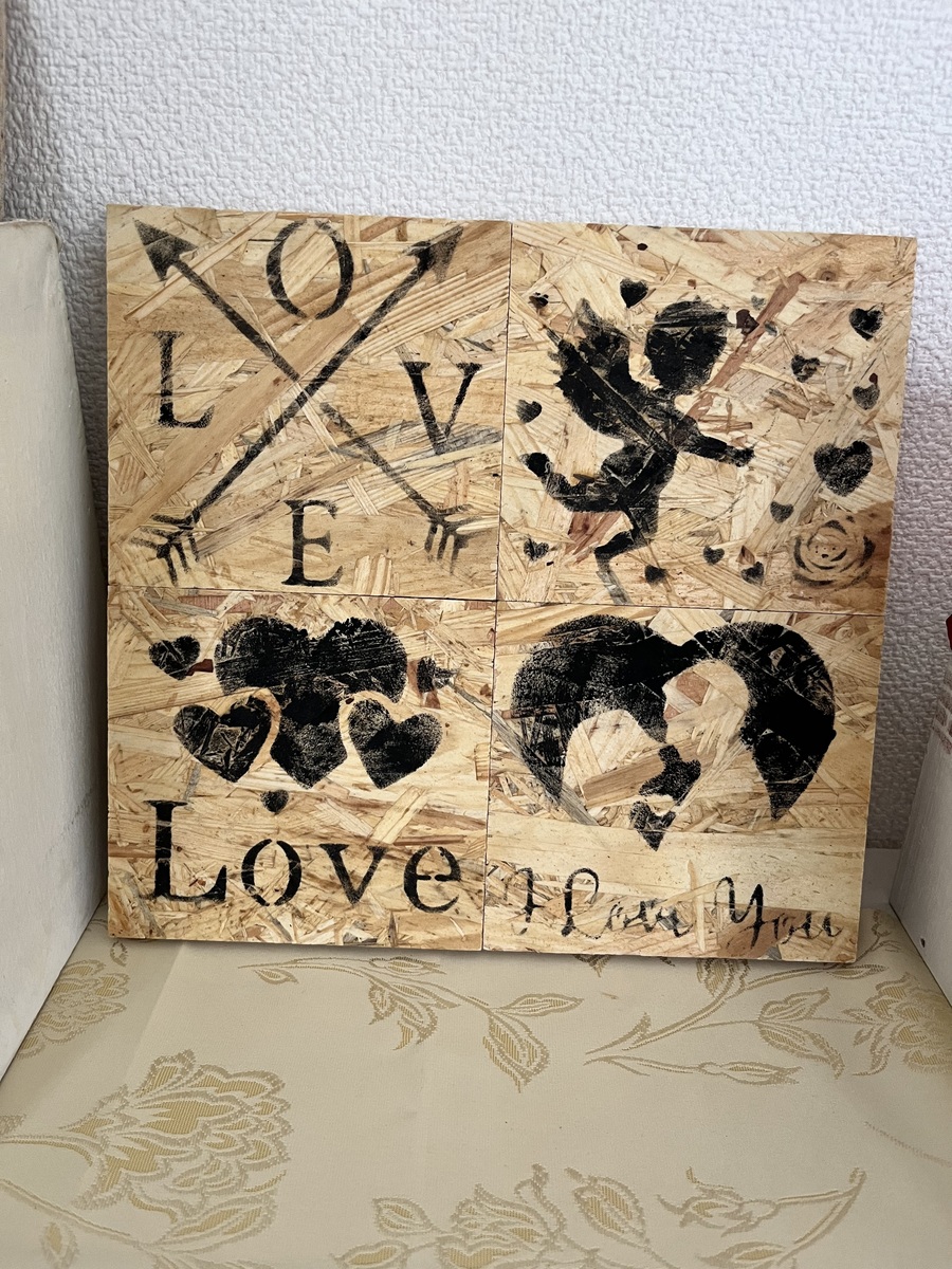 四角いOSB端材11枚あったので残りでステンシルコースターみたく一個一個ステンシルしてみて皆さんの投稿みたく枠を作って飾ろうかとやってみましたが、この合板だと可愛くなかったんです。