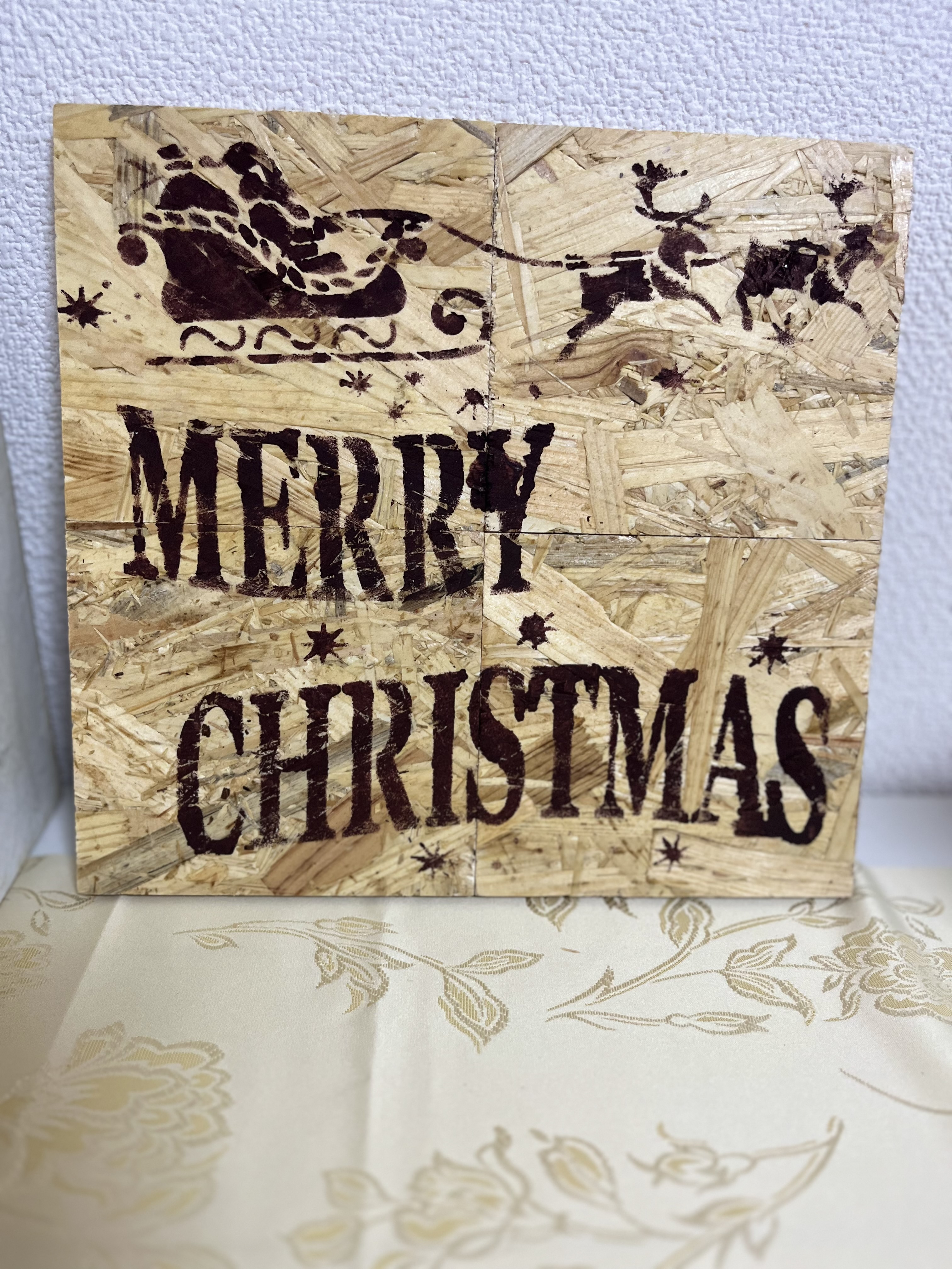 合体させて1枚ものに堂々とステンシルしないと様にならないような気がして、裏返してちと早いけどクリスマスバージョンをチョコレート色で濃くステンシルしました🎅