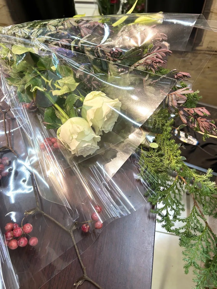 バラ、ユリ、ミモザ(やや赤みのある葉)、ユーカリ、ヒバ、サンキライ