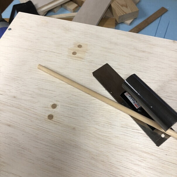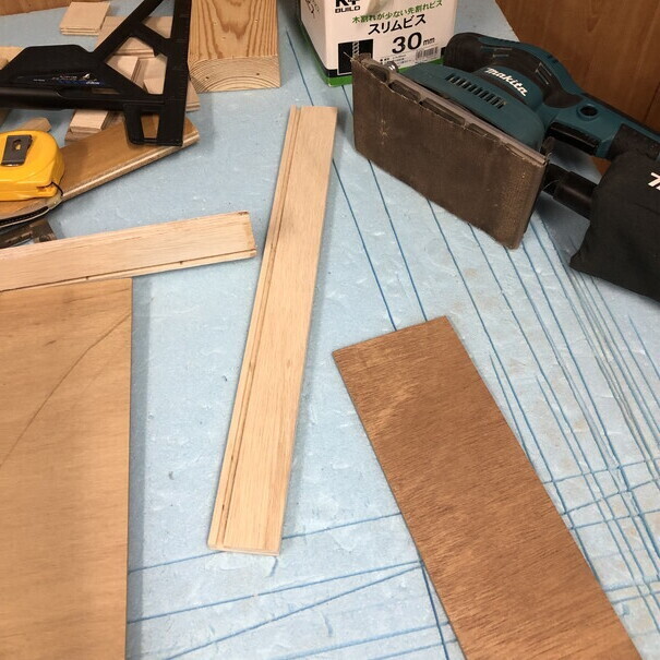 そんなことから「小さいのはダメ。大きく書かなきゃ! A4、いやA3くらいの大きさに、マジックで書くつもりで!」ということになりました。端材の山から使える材を取り出して、作成開始です。