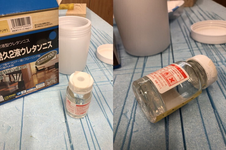 「耐久2液ウレタンニス」を使っていて、ビンのフタが硬くて開けられなかったので、ドリルで穴をあけて出したことがあったんですね。それで今回、使おうと思ったら中身が固まっている……。