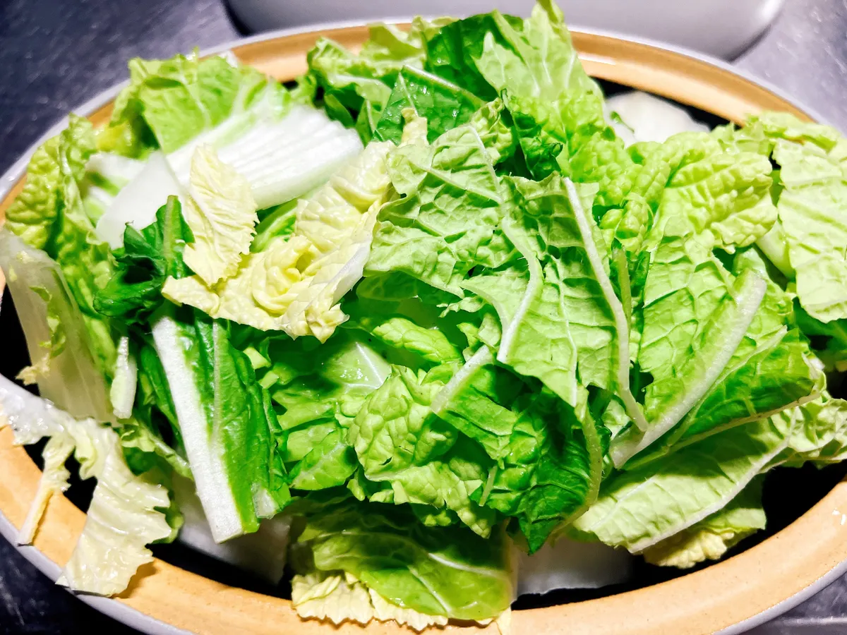 加熱後、蓋を取り白菜が汁に浸かるように軽く混ぜます。