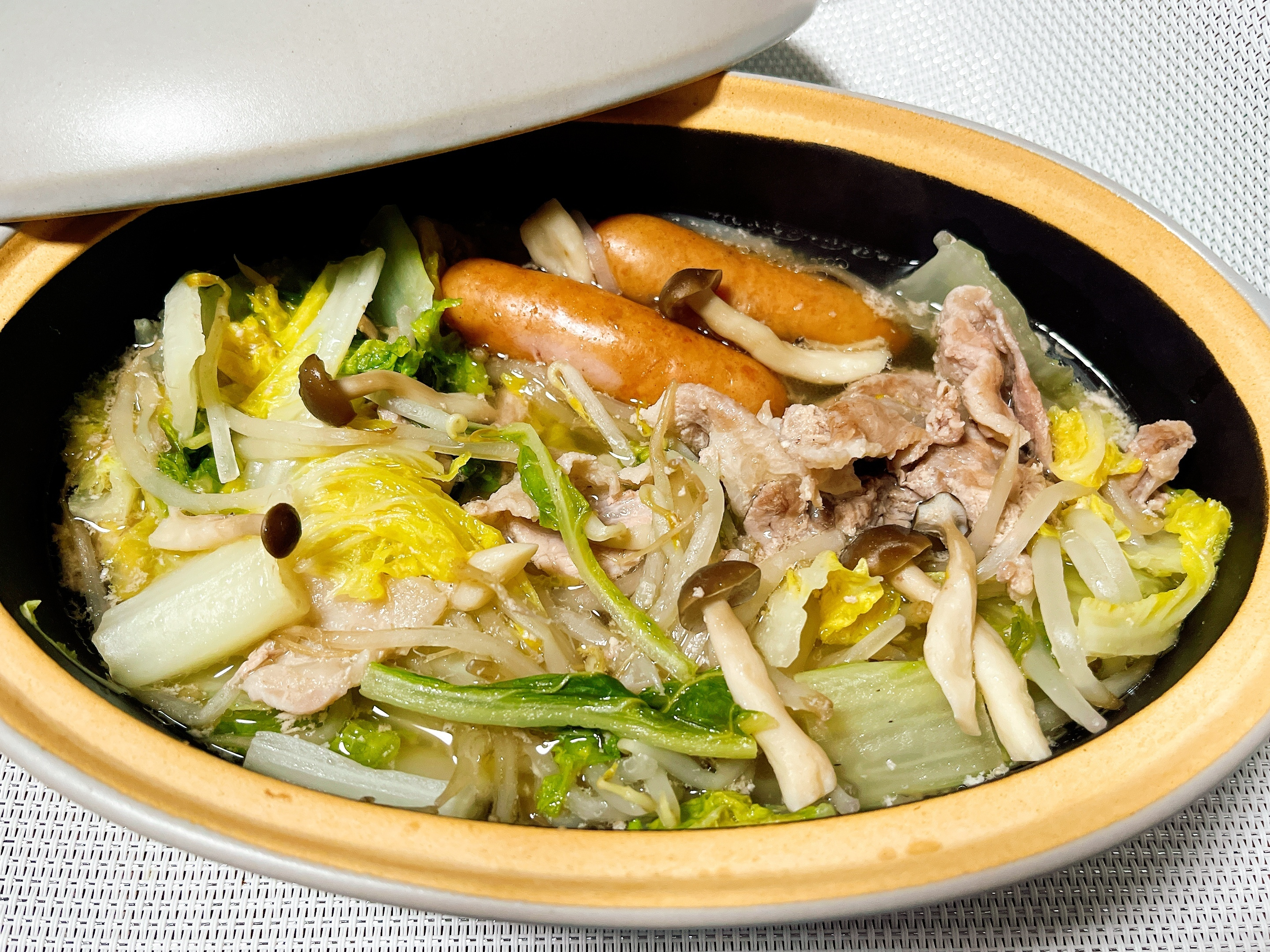 パスタポットに、鍋の素と水を入れてお肉、ウィンナー、しめじを入れその上にもやしと白菜を覆うように入れます。