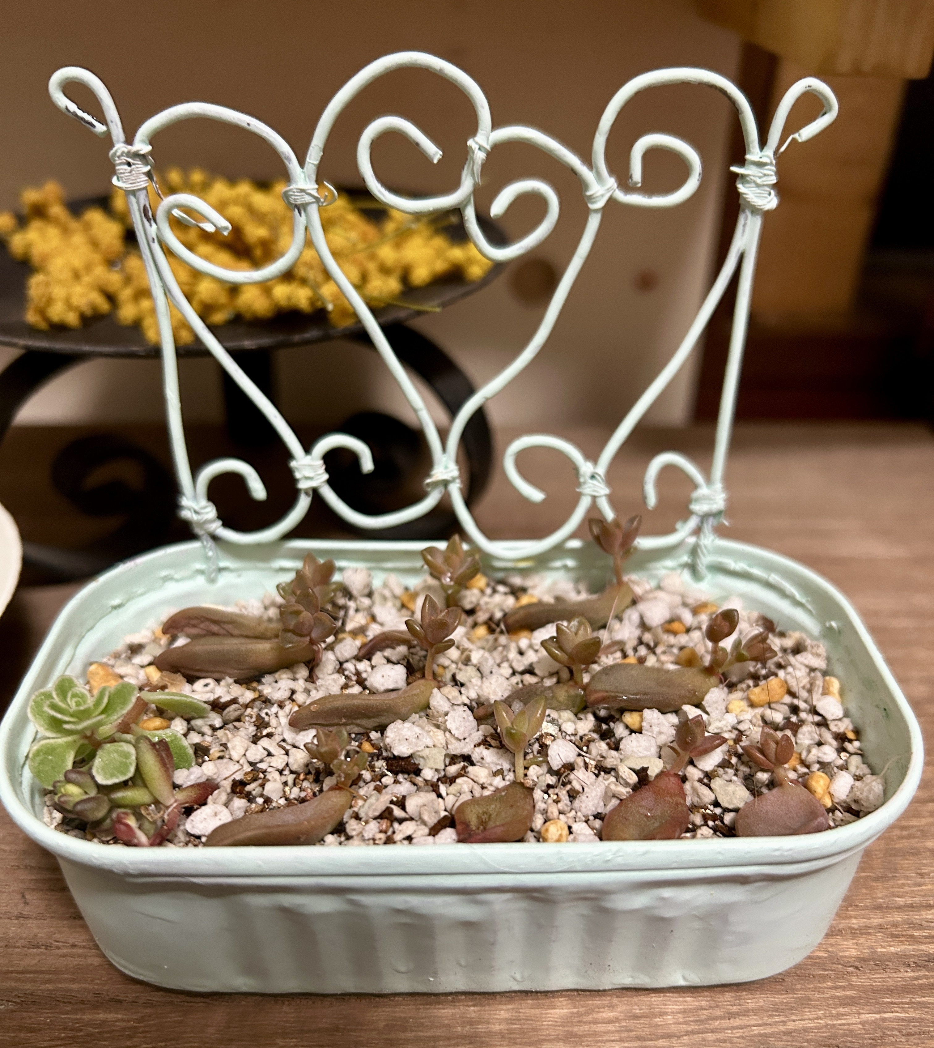 私も今朝、多肉ちゃんの寄せ植えで余った葉っぱを鉢にばらまきました(笑)