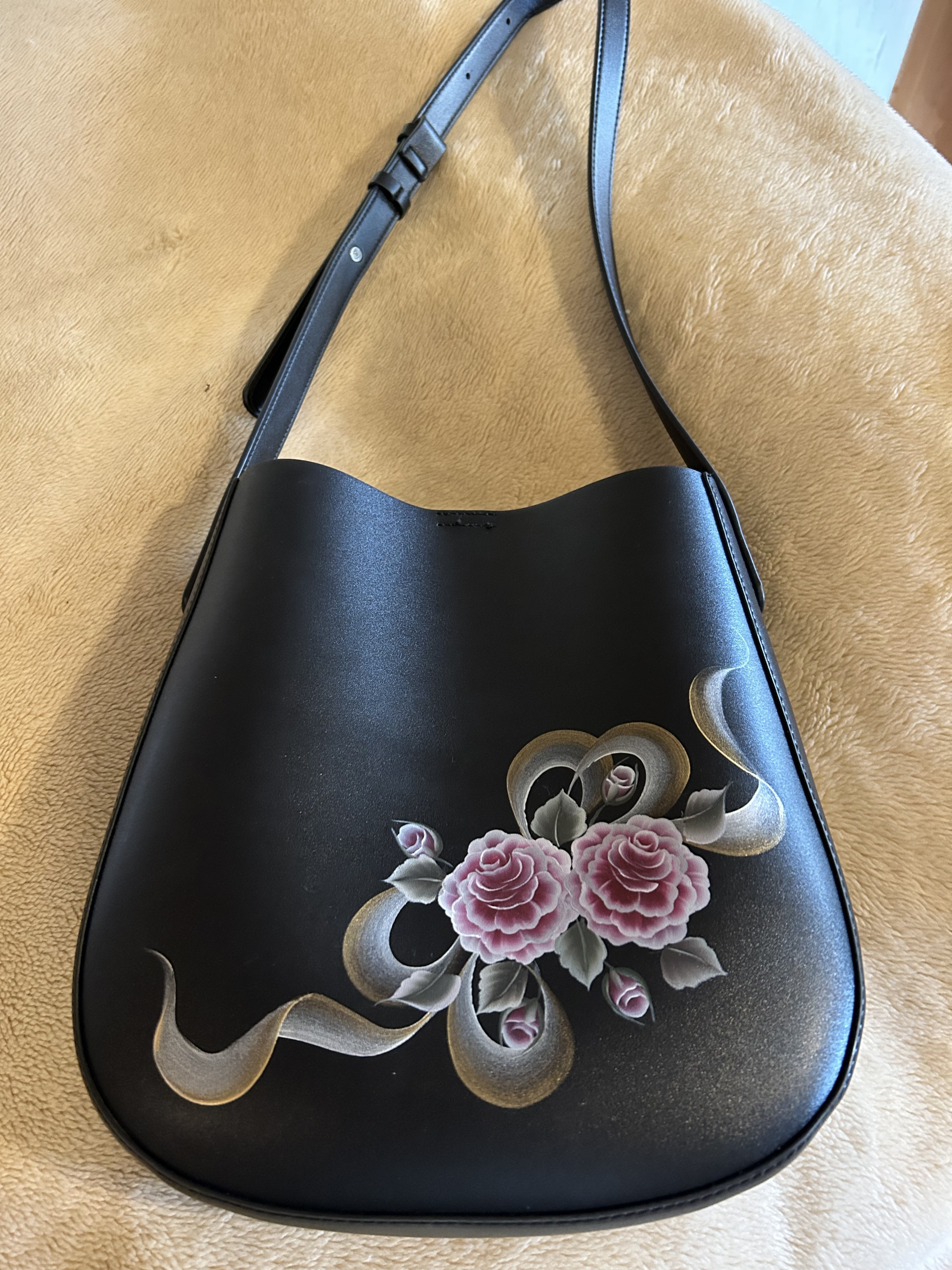 投稿を表示黒地のバックに、淡いシックなカラーの薔薇🌹リボン🎀のゴールド色と流れるような描き方がとても綺麗ですね。🎶音楽鑑賞、お買い物…etc。どんなシチュエーションでも合いそうな素敵なバック👜❤️ですね。