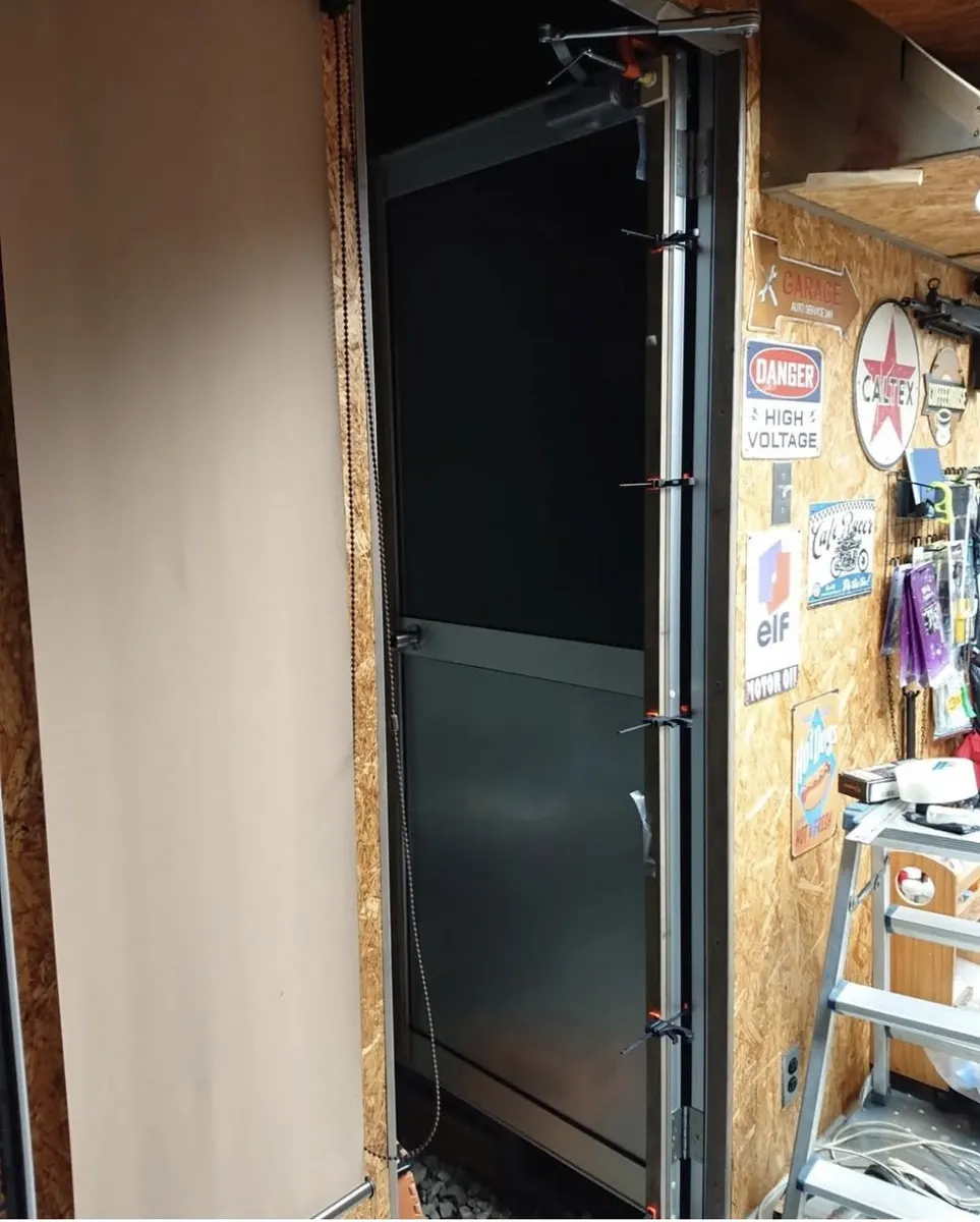 バイク保管庫の内装をOSBボードで仕上げたらアルミドアが浮くったって浮くったって💦