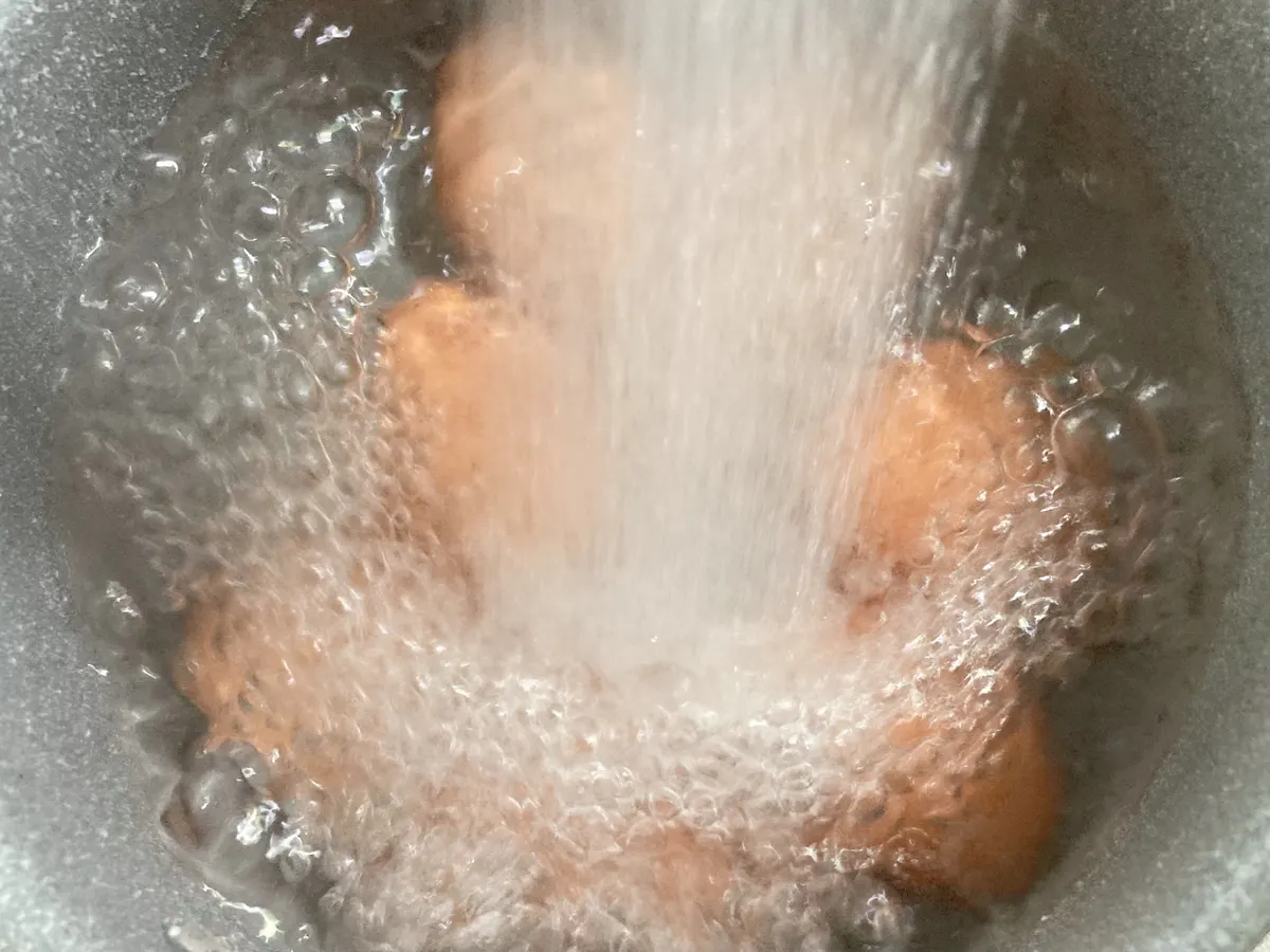 ③おたまにのせた卵をお湯の中に入れて2分くらいコロコロして強火で8分茹でる