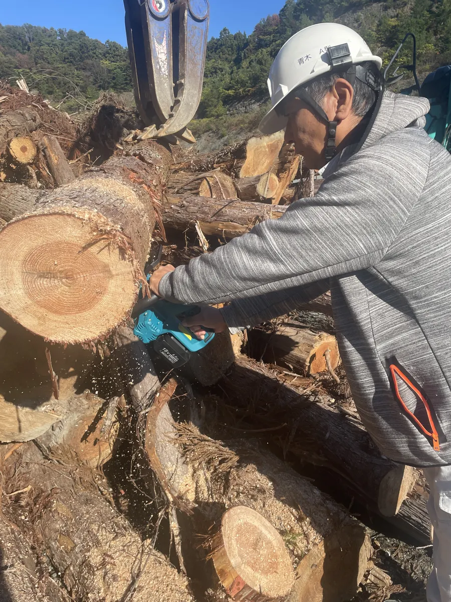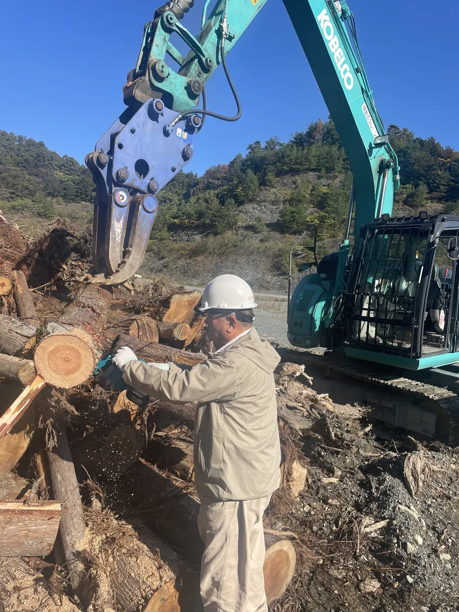 でましたー初登場‼️TEMUおじさん!この重機も動かせるスーパーおじさんです♪チェーンソーで丸太をカットしてます。