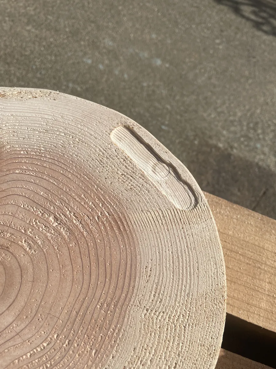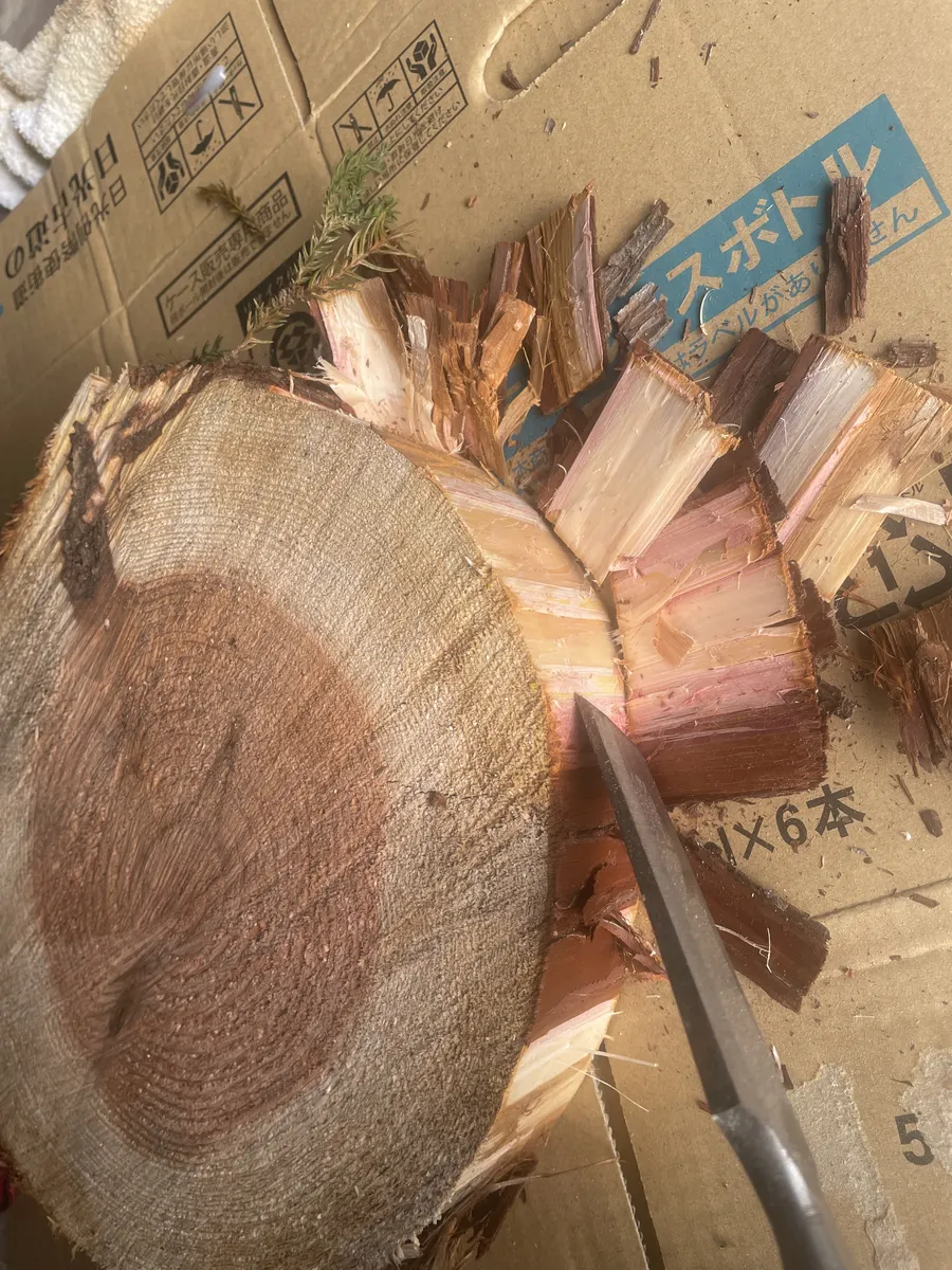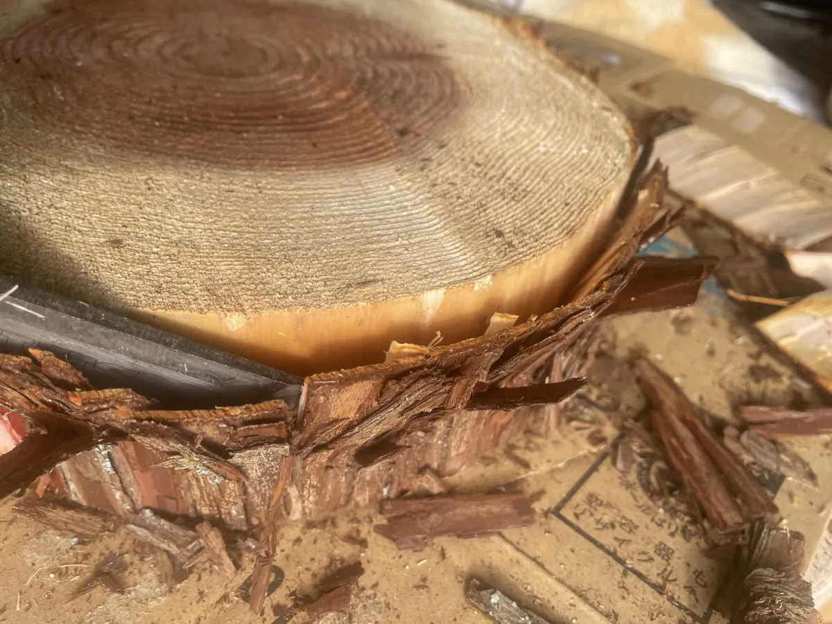 一応、周りの丸太の皮を剥いでみる。3週間程乾燥させてるのに水分すごい👍生きてるんですねー