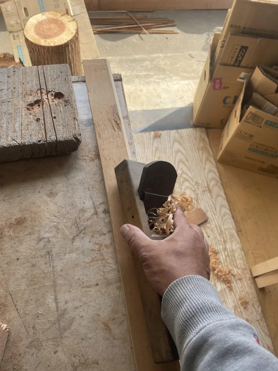 続いて丸くカーブをつける為に板の両端は角度を付けます。丸ノコでカットしても良いのですがカンナの方が良いかなとカンナで作業してますがらコレを何本もやるのかと思うとシンドイ。。。。