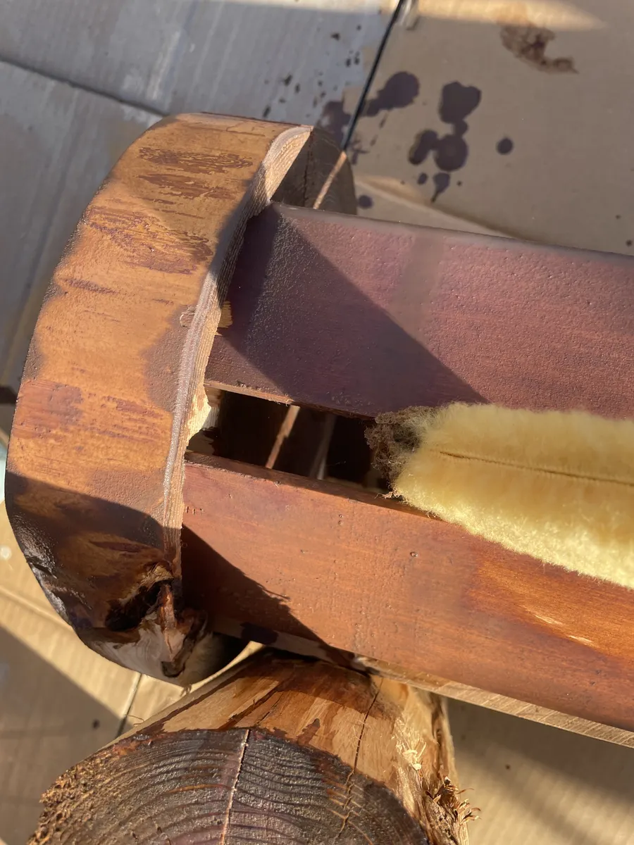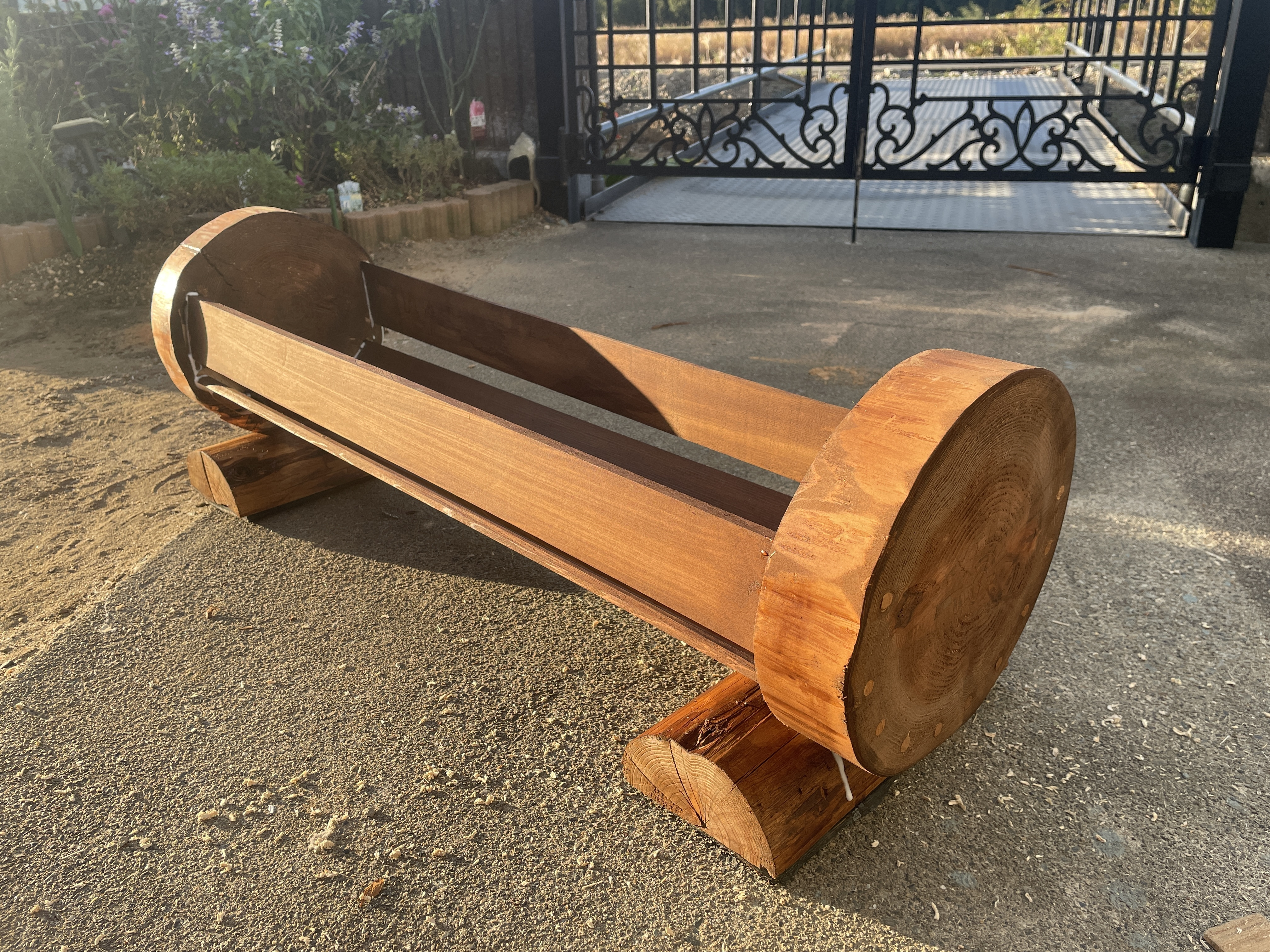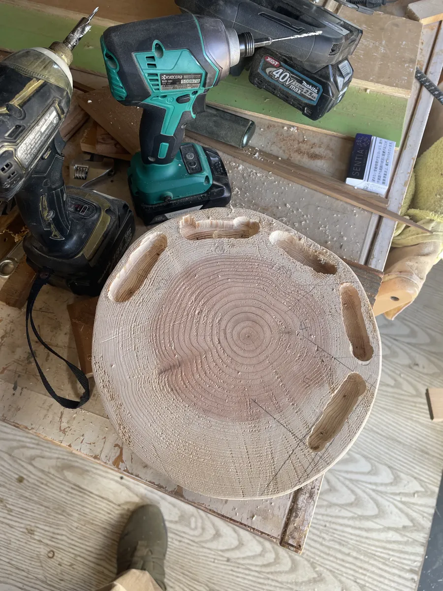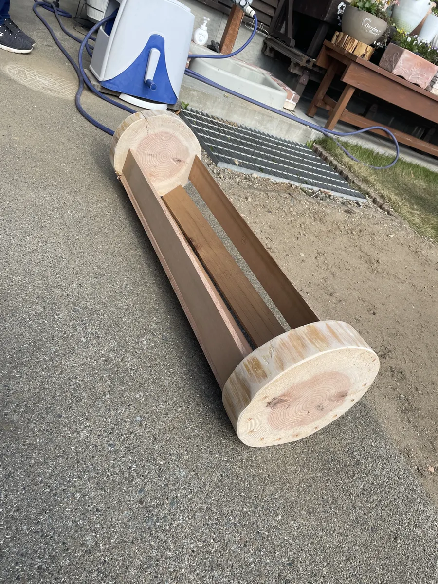 脚の部分は丸太を縦に半分にカットしてます。カットの仕方はナタで無理矢理叩き割りました。